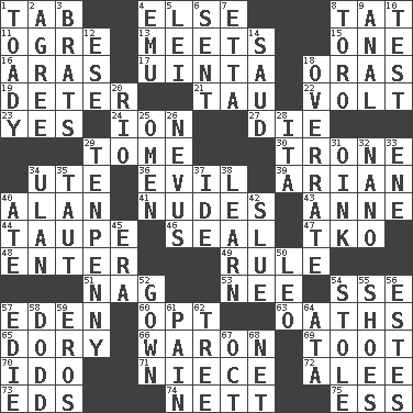 ACROSS 1. Keyboard key 4. Otherwise 8. Make lace 11. Legendary monster 13. Confronts 15. Single 16. Ancient river in northeast Turkey 17. National forest in Provo, Utah 18. Mouths or openings 19. Prevent from occurring 21. The 19th letter of the Greek alphabet 22. Electrical Unit 23. It is so 24. Electrically charged atom 27. Pass on 29. Heavy book 30. Heavy duty weighing machine 34. Shoshoni 36. Morally bad or wrong 39. Believer in; advocate of (suffix) 40. Actor Alda or Thicke 41. Unadorned figures 43. Singer Murray 44. Grayish beige 46. Lick closed 47. Ring climax 48. Keyboard key 49. Governing power 51. Tired old horse 53. Born 54. Compass dir. 57. Locale of original sin 60. Elect 63. Expletives 65. Small, narrow, flatbottom fishing boat 66. Make _____ (do battle with) 69. A blast of a horn 70. Wedding promise 71. Sibling's daughter 72. Toward shelter 73. Begley and Asner 74. Remaining after all deductions 75. Curvy letter DOWN 1. Sycophant 2. Match 3. Naughty children 4. Australian flightless bird 5. Luau accessory 6. Emitted 7. Singer James 8. "Corrida" creature 9. Of or related to the anus 10. Trial 12. Compass dir. 14. Saudi Arabian king (1953-1964) 18. Make much ado about nothing 20. River (Sp.) 25. Presage 26. Mole, birthmark 28. Call ___ day 29. 3-inch nail 31. Pig sound 32. Billionth: prefix 33. Compass dir. 34. ____ Bator 35. Strained 37. Binary compound 38. Memorize 40. Had dinner 42. Change direction abruptly 45. Period 50. Lion 52. Long dress 54. Took without asking 55. Imelda's hoard 56. _____ Park, CO 57. Singer Brickell 58. Texas town _ City 59. Greek god of love 61. Ache 62. Relationship diagram 64. _ moment's notice (2 wds.) 67. Sep. follower 68. Fish or hair follower