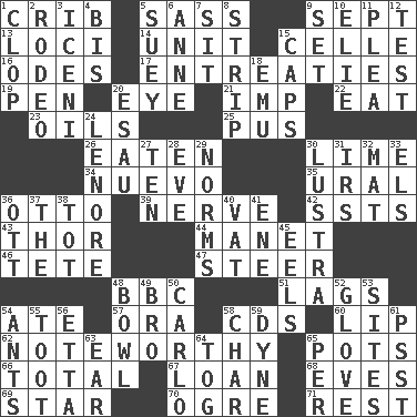 ACROSS 1. Baby bed with high sides 5. Backtalk 9. Back-to-school mo. 13. Locales 14. A single undivided whole 15. Cell (Danish) 16. Lyric poems 17. Pleas 19. Animal enclosure 20. Sight organ 21. Naughty child 22. Ingest 23. Lubricates 25. Suppuration 26. Ingested 30. Welles in "The Third Man" 34. New (sp.) 35. Mountain range 36. "Beetle Bailey" pooch 39. Boldness 42. Fast planes 43. Son of Odin 44. French painter Edouard 46. Wig 47. Bull 48. English channel? 51. Straggles 54. Had dinner 57. Mouth or opening 58. Music discs 60. Mouth edge 62. Music shop? 65. Cooking vessels 66. Add up to 67. Grant temporary use of 68. Nights before holidays 69. Play the lead 70. Legendary monster 71. Remainder DOWN 1. Hoof sound 2. Cowboy competition 3. Ancient Celtic tribe of eastern Britain 4. Again 5. Chop _ 6. Singer Murray 7. Be seated 8. Long narrow piece of something 9. Put into a specified state 10. Writer Wiesel 11. Entreaty 12. Trial 15. Balmoral and tarboosh 18. Australian flightless bird 20. Son of Isaac 24. Poe poem 27. "___ Little Indians" 28. First lady 29. Typical standards 30. A period of five years 31. Big collection agency 32. Floor covering 33. Raised railways 36. Baseball player Mel 37. Definite Article 38. Small child 40. Large container 41. Compass dir. 45. Snakelike fish 48. Soup holder 49. Sis' sibling 50. Monte _, Las Vegas Hotel/Casino 52. Michael Jackson trademark 53. Settings 54. Pismires 55. A blast of a horn 56. Singer James 58. Burn to charcoal 59. Unit of force 61. Inconspicuous attention getter 63. Hearing organ 64. Coat; cloak 65. For each