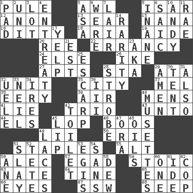 ACROSS 1. Whine 5. Leather borer 8. Austrian river, tributary to the Danube 12. At once, immediately (arch.) 13. Singe 15. Nanny 16. Simple song 18. Operatic vocal solo 19. Helper 20. To riddle 22. Tendancy to err 24. Otherwise 26. D.D.E's nickname 27. Flats, for short 28. R.R. building 29. _ moment's notice (2 wds.) 32. A single undivided whole 35. Municipality 37. Cartoonist voice _ Blanc 38. Suggestive of the supernatural 39. Atmosphere 40. Not women's 41. Whopper 42. Musical group of three 43. To (old English) 44. Raised railways 45. Chop off 46. Expressions of contempt or scorn 49. Cards in a Roman deck? 50. 4th largest of the Great Lakes 51. Paper fasteners 55. Keyboard modifier key 56. Actor Baldwin 57. Mild oath 59. Unemotional 63. Nathan's nickname 64. Prong on a fork 65. Inside; within (prefix) 66. Snake ____ (dice throw) 67. Compass dir. 68. Ooze DOWN 1. Writing tablet 2. University (slang) 3. Car dealer's back yard 4. Plea 5. White ___ sheet 6. Past tense of be (plural) 7. Den 8. Silly 9. Ketch in the Levant 10. Actor Griffith 11. Actress Charlotte 14. Noteworthy scarcity 17. Sharp bark 21. Eastern Standard Time (abbr.) 23. Alias (abbr.) 25. Fortification 28. Disco prop 29. So be it 30. Portable shelter 31. In addition 32. Ubangi River tributary 33. Famous astronaut Armstrong 34. Angers 36. One more than two 40. French bagpipes 42. Bathroom 45. Mouth edge 47. Mouth or opening 48. Petroleums 49. Shoestrings 51. Kill 52. Wig 53. The front part of a cuirass 54. Without 56. A saturated hydrocarbon 58. Morning condensation 60. Single 61. Binary compound 62. Police officer (slang)