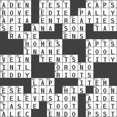 ACROSS 1. Arabian gulf 5. Trial 9. Smile enhancers 13. Be footloose 14. Singer Brickell 15. Chummy 16. Capital of Western Samoa 17. Pleas 19. Put into a specified state 20. Santa ___, CA 21. Male child 22. Make lace 23. Pace 25. Followers of ems 26. Dwellings 30. Flats, for short 34. Lacking in sense or substance 35. Calm and collected 36. Distinctive style or manner 39. Portable shelters 42. Municipality 43. International (abbr.) 44. U. of Maine site 46. Whirlpool 47. Debaucheries 48. Infant locale 51. A whole individual unit 54. Compass dir. 57. _ tizzy (2 wds.) 58. Part of HMS, perhaps 60. Spanish title 62. Boob tube 65. Assistant 66. Clothes sense 67. A blast of a horn 68. Proofreading order 69. Actor Baldwin 70. Inside; within (prefix) 71. Inconspicuous attention getter DOWN 1. Caspian sea tributary 2. Drug addict 3. Webber/Rice musical 4. Teachers' org. 5. Adolescent 6. Pulitzer Prize-winning author Ferber 7. Be seated 8. Laconic 9. Domesticated feline 10. Set down 11. Entreaty 12. System (abbr.) 15. Baking dishes 18. Age 20. Period of immesurable duration 24. Without thickness 27. Floor covering 28. Compass dir. 29. Sir (Sp.) 30. Buttonhole 31. Luau course 32. Small child 33. Secret 36. Compete 37. Conclusion 38. It would 40. Three (prefix) 41. "Barney Miller" actor Jack 45. Nuclear Threat Initiatives 48. Not recorded 49. Black tropical American cuckoo 50. Thick mixture 52. Proofreads 53. Methods 54. Singer James 55. Lick closed 56. Otherwise 58. Parka part 59. To the inside or interior of 61. Remaining after all deductions 63. And so on (abbr.) 64. Electrically charged atom 65. Cleo's killer