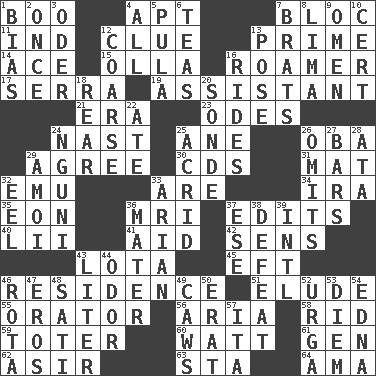 ACROSS 1. Surprise greeting 4. Fitting 7. Coalition 11. Working for oneself (abbr.) 12. A slight indication 13. A-one 14. Adept person 15. Spanish pot 16. Wanderer 17. Father Junipero _ 19. Aide 21. Period 23. Lyric poems 24. Political cartoonist Thomas 25. A saturated hydrocarbon 26. Chief or king in Benin or Nigeria 29. Match 30. Music discs 31. Floor protector 32. Australian flightless bird 33. "We ___ not amused" (Victoria) 34. Lyricist Gershwin 35. Age 36. Medical imaging device (abbr.) 37. Prepares for publication 40. Cards in a Roman deck? 41. Help 42. Elected reps. 43. Globular water bottle used in Asia 45. Newt 46. Dwelling 51. Dodge 55. Speaker 56. Roberta Peters solo 58. To free from 59. Carrier 60. Electrical Unit 61. Commissioned mil. rank 62. SW Saudi Arabia district 63. R.R. building 64. Housemaid (var.) DOWN 1. Prejudice 2. Single time 3. River in Europe 4. 100% 5. Monetary unit of Botswana 6. Afternoon social gatherings 7. Naughty children 8. Pale green bean 9. Presage 10. Sure thing 12. Unrefined 13. Introduce or present, as a question 16. Amusement-park features 18. Bring up, as a child 20. Message 22. Had dinner 24. Group of southern Bantu languages 25. Sour-tasting 26. Leaves out 27. Taverns 28. _ moment's notice (2 wds.) 29. Mine, in Marseilles 32. Snakelike fish 33. Believer in; advocate of (suffix) 36. Mother 37. Compass dir. 38. Outscore 39. International (abbr.) 43. 61 cubic inches 44. Aroma 46. Round or rotation of duties 47. Greek god of love 48. Suttee (variant) 49. Crow sounds 50. Part of Q.E.F. 52. Capital and largest city of Mongolia 53. South Vietnam president (1954) 54. Pulitzer Prize-winning author Ferber 57. Call ___ day