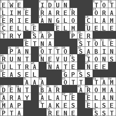 ACROSS 1. She-sheep 4. Goddess of spring and wife of Bragi 8. Small child 11. Welles in "The Third Man" 13. More uncommon 15. Mouth or opening 16. 4th largest of the Great Lakes 17. White American of non-Hispanic descent 18. Burrowing marine mollusk 19. Cell (Danish) 21. Shade tree 22. Ubangi River tributary 23. Attempt 24. Plant excrement 27. For each 29. Inactive volcano in Sicily 30. Took without asking 34. Baking dish 36. Von Bismarck 39. Unit of acoustic absorption 40. Undersized animal 41. Congenital growth or mark on the skin 43. Charged atoms 44. Extreme 46. Nathan's nickname 47. Born 48. Artist's stand 49. Global Positioning Systems (abbr.) 51. Auto club (abbr.) 53. Baseball player Mel 54. Scottish cap 57. Incision 60. Long, evenly shaped piece 63. Odor 65. Like ___ of sunshine 66. Having winglike extensions 69. Flair 70. Atlas unit 71. Receives possession of 72. Otherwise 73. Parent Teacher Association (abbr.) 74. French philosopher Descartes 75. Fast jet (abbr.) DOWN 1. Voters do this 2. One who wires 3. Poet Dickinson 4. Retirement account (abbr.) 5. One of the 12 tribes of Israel 6. Goad 7. 1994 drama film starring Jodie Foster 8. Lacquered or enameled metalware 9. Taken by mouth 10. Not wild 12. Snakelike fish 14. Play 18. Window treatments 20. Eastern Standard Time (abbr.) 25. Soon (poet.) 26. Eucharist need 28. Curvy letter 29. Plea 31. Mitch Miller's instrument 32. Actor's bit 33. Followers of ems 34. Monetary unit of Botswana 35. Pismires 37. Federal power corp. 38. Expenditure 40. Regret 42. Back-to-school mo. 45. Insect wing 50. R.R. building 52. Blind as ____ 54. For Whom the Bell _____ 55. Collect or gather 56. French painter Edouard 57. Moist 58. Part of Q.E.F. 59. California wine valley 61. Having or resembling wings 62. Libertine 64. To riddle 67. Nine, plus one 68. Compass dir.