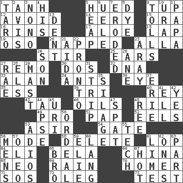 ACROSS 1. Hyperbolic tangent 5. Became colored 9. Uncastrated adult male sheep 12. Keep away from 14. Suggestive of the supernatural 15. Mouth or opening 16. Remove soap 17. Medicinal plant 18. Pet locale 19. Bear (Spanish) 20. Slept 23. Silent film actress Nazimova 24. Move through with a circular motion 25. Hearing organs 27. San ____ (Riviera town) 30. Two (Sp.) 32. Heredity factor (abbr.) 33. ____ Jay Lerner 34. Pismires 36. Sight organ 38. Double-curved letter 39. Three (prefix) 40. Marina Del _, California 43. The 19th letter of the Greek alphabet 46. Petroleums 48. Cause heat under the collar 49. Adept person 51. Infant food 52. Snakelike fish 53. SW Saudi Arabia district 54. Yard entry 56. Method 58. Erase 61. Trim (branches) 64. Biblical high priest 65. Actor Lugosi 66. Large country 68. Modern: prefix 69. Precipitation 70. Home run 71. Distress signal 72. Cassini of fashion 73. Trial DOWN 1. Edible starchy tuberous root 2. Opinion 3. Words to Nanette 4. Part of HMS, perhaps 5. Pile 6. Ubangi River tributary 7. Worn away 8. Color 9. For Whom the Bell _____ 10. Mountain range 11. Dad 13. Incision 21. Opera by Verdi 22. Right away 23. Like ___ of sunshine 24. Male offspring 26. One (Scot) 27. Actress Charlotte 28. Raised railways 29. Vertical spar for supporting sails 31. Long narrow piece of something 35. Fodder prepared in a silo 37. 4th largest of the Great Lakes 41. Pipe bend 42. It is so 44. Domed church section 45. RI univ. 47. Petty quarrel 48. To sift 50. Severe or trying experience 53. Goodbye (Sp.) 55. Georgia ____ (Atlanta school) 56. Not women's 57. Margarine 59. Writer Wiesel 60. Austrian-born American filmmaker Fritz 61. Welles in "The Third Man" 62. Washington bills 63. Component 65. Sis' sibling 67. Being at a high temperature