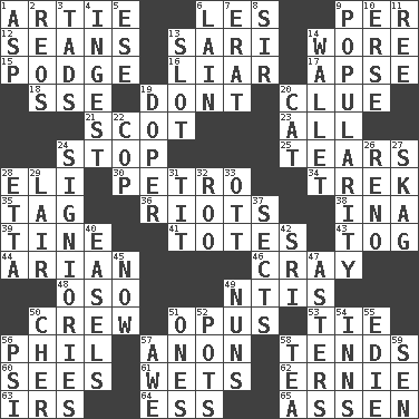 ACROSS 1. Nick name for Arthur 6. French article 9. For each 12. Actors Connery and Penn 13. Indian skirt 14. Had on 15. Porridge 16. One who doesn't tell the truth 17. Domed church section 18. Compass dir. 19. Do not 20. A slight indication 21. Native of Scotland 23. 100% 24. Constrict 25. Pulls apart 28. Biblical high priest 30. Stone: prefix 34. Long journey 35. Label 36. Disturbances 38. _ tizzy (2 wds.) 39. Prong on a fork 41. Hauls 43. Coat; cloak 44. Believer in; advocate of (suffix) 46. Supercomputer manufacturer 48. Bear (Spanish) 49. Nuclear Threat Initiatives 50. Group working together 51. Musical composition 53. Neckwear 56. Silvers or Donahue 57. Soon (poet.) 58. Watches over 60. Observes 61. Soaks 62. Bert's buddy 63. Big collection agency 64. Double-curved letter 65. NE Netherlands city DOWN 1. Viper 2. Vintage cars 3. Small amounts or degrees 4. Consume 5. Compass dir. 6. (Had) reclined 7. Part of Q.E.F. 8. Title for a knight 9. Teen's desire 10. Celtic language 11. To sift 13. Narrow opening 14. Place for singles 19. Drug addict 20. Feline 22. Police officer (slang) 24. Seigniories (variant) 26. Former U.S. Attorney General Janet 27. Heroin 28. Singer James 29. Den 31. Teat (slang) 32. Friend of Pooh 33. Baseball player Mel 37. Religious groups 40. Artist's stands 42. Indian title of respect (Mr.) 45. Immediately 47. Michaelmas daisies 49. Religious women 50. "Mermaids" star 51. Singles 52. Plant holders 54. Restaurants 55. Singer Brickell 56. Air pressure measure (abbr.) 57. Deep reverence 58. Afternoon social gathering 59. Elected rep.