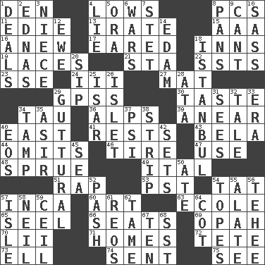 ACROSS 1. Lair 4. Coldest temperatures 8. Personal Computers (abbr.) 11. Singer Brickell 13. Feeling or showing extreme anger 15. American Automobile Association (abbr.) 16. Afresh 17. Having ears or earlike features 18. Taverns 19. Shoestrings 21. R.R. building 22. Fast planes 23. Compass dir. 24. One more than two 27. Floor covering 29. Global Positioning Systems (abbr.) 30. Clothes sense 34. The 19th letter of the Greek alphabet 36. High mountains 39. Approach 40. 90 degrees 41. Musical pauses 43. Actor Lugosi 44. Leaves out 46. Hoop that covers a wheel 47. Purpose 48. Disorder 49. Slanted text style (abbr.) 51. Reproach for some lapse or misdeed 53. Pacific Standard Time (abbr.) 54. Make lace 57. South American Indian 60. Nonscientific branch of learning 63. Learning spot: Fr. 65. Stitch closed the eyes of (a falcon) 66. Theater features 69. Brightly colored fish 70. Cards in a Roman deck? 71. Dwellings 72. Wig 73. Pipe bend 74. Emitted 75. Observe DOWN 1. Allots cards 2. Ferber et al. 3. Sibling's daughter 4. Whopper 5. Mouth or opening 6. Armed conflicts 7. Proofreading order 8. Baking dishes 9. Patter 10. Backtalk 12. She-sheep 14. Dutch treat 18. Byzantium, centuries later 20. Small drink 25. Austrian river, tributary to the Danube 26. Small island 28. _ moment's notice (2 wds.) 29. From the throat 31. Observes 32. Falsehood 33. Period 34. Pack (down) 35. SW Saudi Arabia district 37. Air pressure measure (abbr.) 38. Long narrow piece of something 40. Greek goddess of the dawn 42. Arranges properly for use 45. Ocean 50. Had dinner 52. Romantic infatuation 54. Drinks excessively 55. Having winglike extensions 56. Giggle 57. Capri or Wright 58. Famous astronaut Armstrong 59. To provide with a ceiling 61. Vintage cars 62. Docile 64. Small bed 67. Nine, plus one 68. Fast jet (abbr.)