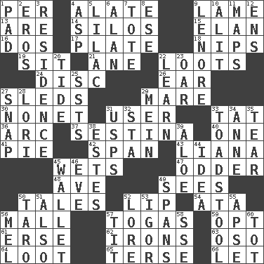 ACROSS 1. For each 4. Having winglike extensions 9. Unable to walk 13. "We ___ not amused" (Victoria) 14. Grain storage towers 15. Enthusiasm 16. Two (Sp.) 17. Food holder 18. Pinches, bites 19. Be seated 21. One (Scot) 22. Plunders 24. Flat circle 26. Ewer handle 27. Bobsleighs 29. Female horse 30. Music written for nine 31. One who uses or employs something 33. Make lace 36. Curve 37. French poetic form 40. Single 41. Sliced dessert 42. Connect, as a bridge 43. Climbing, woody, usually tropical vines 45. Moistens 47. More peculiar 48. "___ Maria" 49. Observes 50. Falsehoods 52. Mouth edge 54. _ moment's notice (2 wds.) 56. Promenade 57. Ancient Roman robes 59. Elect 61. Celtic language 62. Removes the wrinkles 63. Bear (Spanish) 64. Spoils 65. Laconic 66. Allow DOWN 1. Groovy apt. 2. Greek god of love 3. Dwelling 4. Viper 5. Pale purple color 6. Actor Alda or Thicke 7. Carryall 8. Compass dir. 9. Poe poem 10. Came down and settled, as after flight 11. Atlas contents 12. Followers of ems 20. Periodic rise and fall of the sea level 22. Acquire or gain knowledge or skills 23. Boat paddle 25. Fast planes 27. Fastener 28. Australian parrot (variant) 29. Chow _ 31. United States Postal Service (abbr.) 32. R.R. building 33. Inedible or poisonous agaric 34. Singer Murray 35. Pull into pieces 38. _____ Park, CO 39. _ vera 44. The content of cognition 45. Place for singles 46. Night before a holiday 49. Connects, as a bridge 50. Pacific island yam 51. In addition 52. Old wives' tales, e.g. 53. Composer Stravinsky 55. Domed church section 56. Cartoonist voice _ Blanc 57. Teat (slang) 58. Compass dir. 60. Small child