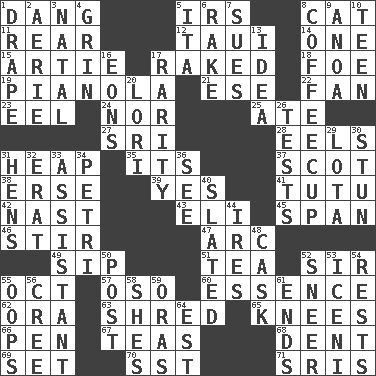 ACROSS 1. Mild oath, euphamism for damn 5. Big collection agency 8. Feline 11. Hitchcock's "____ Window" 12. "Change" in Tahitian 14. Single 15. Nick name for Arthur 17. Swept the length of 18. Enemy 19. Player piano 21. Compass dir. 22. Air blower 23. Snakelike fish 24. And not 25. Had dinner 27. _ Lanka 28. Snakelike fish 31. Pile 35. It is 37. Native of Scotland 38. Celtic language 39. Affirmative reply 41. Ballerina skirt 42. Political cartoonist Thomas 43. Biblical high priest 45. Connect, as a bridge 46. Use a spoon 47. Curve 49. Small drink 51. Afternoon social gathering 52. Title for a knight 55. Sep. follower 57. Bear (Spanish) 60. Center 62. Mouth or opening 63. Tear up 65. Leg joints 66. Fenced enclosure 67. Afternoon social gatherings 68. Incision 69. Arrange properly for use 70. Fast jet (abbr.) 71. Indian titles of respect DOWN 1. Window treatment 2. Nest on high 3. Brizilian seaport 4. Amused look 5. Call ___ day 6. Immoral or dissolute person 7. Takes to court 8. Java holder (2 wds.) 9. Small Philippine buffalo 10. Adolescent 13. It may be bright or harebrained 16. Immeasurably long periods of time 17. Noteworthy scarcity 20. Australian parrot (variant) 26. Trials 29. Globular water bottle used in Asia 30. Make senseless or dizzy 31. Coop moms 32. Part of Q.E.F. 33. Aide 34. _ dish (used to culture cells) 36. Observe 40. Scheduled 44. Angers 48. Keg 50. Mail 52. Contemptuous expression 53. Ancient Celtic tribe of eastern Britain 54. Musical pauses 55. I made a mistake 56. Algonquian 58. "______ My Girl" (Turtles hit) 59. Mouths or openings 61. Conclusions 64. Eastern Standard Time (abbr.)