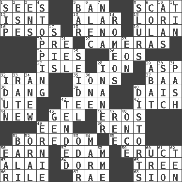 ACROSS 1. Observes 5. Bar 8. Get outta here! 12. Is not 13. Having or resembling wings 15. Australian parrot (variant) 16. Mexican monetary units 18. Western Nevada city 19. ____ Bator 20. Before (prefix) 22. Devices for capturing images 24. Sliced desserts 26. Greek goddess of the dawn 27. Capri or Wright 28. Electrically charged atom 29. Viper 32. SW Asia republic 35. Charged atoms 37. Sound made by sheep 38. Mild oath, euphamism for damn 39. Heredity factor (abbr.) 40. Raised platform 41. Shoshoni 42. Adolescent 43. Hankering 44. ___ Haven, CT 45. Set 46. Greek god of love 49. Car or cant ending 50. Monthly bill 51. Mood resulting from idleness 55. Environmental prefix 56. Merit 57. Dutch treat 59. Spew [out] 63. Mountain range southwest of Kyrgyzstan 64. Dormintory (informal) 65. Family _ (genealogy) 66. Cause heat under the collar 67. Actress Charlotte 68. The Jewish people; Israel DOWN 1. Small drink 2. Compass dir. 3. Followers of ems 4. Ceasing 5. Long, evenly shaped piece 6. Actor Baldwin 7. Nanny 8. Disparaging remarks 9. Root beer relative 10. Caspian sea tributary 11. Shallow baking pan 14. Lover boys 17. Indian titles of respect 21. Snakelike fish 23. Period of immesurable duration 25. A glass for beer 28. Sillier 29. Blind as ____ 30. Ketch in the Levant 31. Romantic infatuation 32. Goddess of spring and wife of Bragi 33. Pace 34. Afresh 36. Single 40. What propaganda does 42. Watched over 45. Turn to the right 47. To riddle 48. Single time 49. Bert's buddy 51. Indonesian resort city 52. Taken by mouth 53. Aroma 54. Hindu Mythology: god of death 56. Hearing organ 58. Madame (abbr.) 60. RI univ. 61. Corporate head (abbr.) 62. Nine, plus one