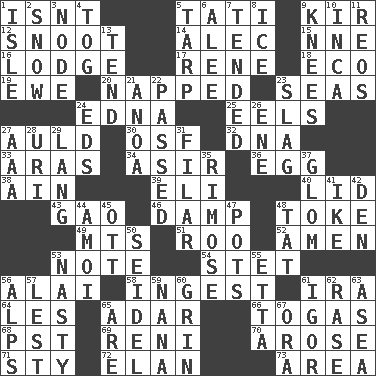 ACROSS 1. Is not 5. Jacques of French films 9. Apertif with cassis 12. Snout, nose 14. Actor Baldwin 15. Compass dir. 16. Inn 17. French philosopher Descartes 18. Environmental prefix 19. She-sheep 20. Slept 23. Oceans 24. Pulitzer Prize-winning author Ferber 25. Snakelike fish 27. Old (Scot.) 30. Order of Saint Francis (abbr.) 32. Heredity factor (abbr.) 33. Caspian sea tributary 34. SW Saudi Arabia district 36. Ovum 38. The 18th letter of the Arabic alphabet 39. Biblical high priest 40. Hat (slang) 43. E Mali city 46. Moist 48. Casino tip 49. Mountains (abbr.) 51. Friend of Pooh 52. So be it 53. Make mention of 54. Proofreading order 56. Mountain range southwest of Kyrgyzstan 58. Swallow 61. Retirement account (abbr.) 64. French article 65. The sixth month of the Jewish calendar 66. Ancient Roman robes 68. Pacific Standard Time (abbr.) 69. Painter Guido (1575-1642) 70. Came up 71. Filthy place 72. Style 73. Length times width DOWN 1. Capri or Wright 2. Frozen precipitation 3. Thickened enlargement 4. Coat; cloak 5. Canvas cover 6. Toward shelter 7. Watched over 8. Frozen water 9. Leg joints 10. South American Indian 11. Vintage cars 13. Look after 21. Small Philippine buffalo 22. Went by 23. Volcanic refuse 24. Begley and Asner 26. Compass dir. 27. American Automobile Association (abbr.) 28. RI univ. 29. Long (Scottish) 31. Of or pertaining to a thread or threads 35. Full of chinks, cracks, or crevices 37. Seize upon or latch onto something 41. Mamie's husband 42. Lair 44. Mine, in Marseilles 45. Baseball player Mel 47. Cooking vessels 48. Make lace 50. Beer mug 53. Characterized by obscenity 55. Singer James 56. High mountains 57. For fear that 59. Grandmother 60. Smile widely 61. Composer Stravinsky 62. Raze (variant) 63. Toward the sea 65. "We ___ not amused" (Victoria) 67. Mouth or opening