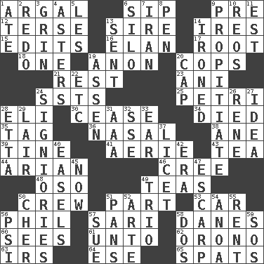 ACROSS 1. Therefore, facetiously 6. Small drink 9. Before (prefix) 12. Laconic 13. Title for a man of rank and authority 14. Angers 15. Prepares for publication 16. Liveliness 17. Carrot, for example 18. Single 19. Soon (poet.) 20. 911 reaches them 21. Relief 23. Cuckoo 24. Fast planes 25. _ dish (used to culture cells) 28. Biblical high priest 30. Desist 34. Passed on 35. Label 36. Rhinal 38. One (Scot) 39. Prong on a fork 41. Nest on high 43. Beverage made from leaves 44. Believer in; advocate of (suffix) 46. Algonquian 48. Bear (Spanish) 49. Afternoon social gatherings 50. Ship's personnel 51. Piece 53. 4-wheeled motor vehicle 56. Silvers or Donahue 57. Indian skirt 58. Natives or inhabitants of Denmark 60. Perceives with the eye 61. To (old English) 62. U. of Maine site 63. Big collection agency 64. Compass dir. 65. Arguments over trivial matters DOWN 1. Had dinner 2. Do over again 3. Smile widely 4. Michaelmas daisies 5. French article 6. Grain storage tower 7. SW Asia republic 8. Animal enclosure 9. Conciliate 10. Vintage cars 11. Eastern Standard Time (abbr.) 13. Posted 14. Pressed 19. NE Netherlands city 20. Head covering 22. And so on (abbr.) 24. Seigniories (variant) 26. French philosopher Descartes 27. The main thing one is thinking about 28. Singer James 29. Den 31. American Automobile Association (abbr.) 32. Compass dir. 33. Hearing organ 37. It is permitted: Lat. 40. Artist's stands 42. Epoch 45. At this time 47. Fortification 49. Musical group of three 50. "Mermaids" star 51. Baking dishes 52. Johnson of "Laugh-In" 54. Small Philippine buffalo 55. Monthly bill 56. 23rd letter of the Greek alphabet 57. Take to court 58. Two (Sp.) 59. Distress signal