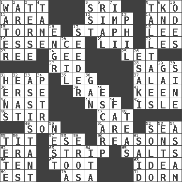 ACROSS 1. Electrical Unit 5. Indian title of respect (Mr.) 8. Ring climax 11. Type of rug 12. Simple or foolish person 14. Added to 15. Singer Mel 17. Staphylococcus 18. Area sheltered from the wind 19. Substance 21. Cards in a Roman deck? 22. French article 23. To separate or throw off 24. Unit of force equal to gravity 25. Allow 27. To free from 28. Droops 31. Pile 35. Part of a journey 37. Jai ____ 38. Celtic language 39. Actress Charlotte 41. Peachy ____! 42. Political cartoonist Thomas 43. Science/research agcy. 45. Capri or Wright 46. Commotion 47. Domesticated feline 49. Male child 51. "We ___ not amused" (Victoria) 52. Ocean 55. Teat (slang) 57. Compass dir. 60. Thinks logically 62. Period 63. Long narrow piece of something 65. Table seasonings 66. Nine, plus one 67. A blast of a horn 68. It may be bright or harebrained 69. Eastern Standard Time (abbr.) 70. White ___ sheet 71. Dormintory (informal) DOWN 1. Wetness 2. Came up 3. Laconic 4. Docile 5. Fast jet (abbr.) 6. Monetary unit of Yemen 7. Body of Kaffir warriors 8. Baron Munchausen's specialties 9. Leg joint 10. Lyric poems 13. Silvers or Donahue 16. Engineer (abbr.) 17. Sowing specialist 20. To provide with a ceiling 26. 1973 Nobel Price Winner (Physics) Leo 29. Highlander 30. Trig term 31. Coop moms 32. Part of Q.E.F. 33. Helper 34. Stone: prefix 36. Separate the seeds from cotton 40. Fortification 44. Conductor's collection 48. Beverages made from leaves 50. A home for chicks 52. Twentieth part of a lira 53. Keyboard key 54. Indian state 55. False hair 56. Angers 58. Portico 59. Greek god of love 61. Alleged 64. Call ___ day