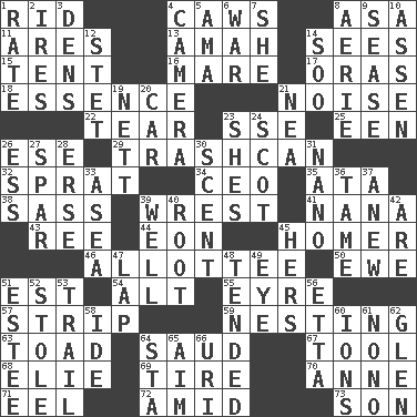 ACROSS 1. To free from 4. Crow sounds 8. White ___ sheet 11. Ancient Greek god of war 13. Nursemaid 14. Observes 15. Portable shelter 16. Female horse 17. Mouths or openings 18. Core 21. Annoying sound 22. Pull into pieces 23. Compass dir. 25. Car or cant ending 26. Compass dir. 29. File 13 32. Small fatty European fish 34. Corporate head (abbr.) 35. "One Day ___ Time" 38. Backtalk 39. Obtain by seizing forcibly or violently 41. Nanny 43. To riddle 44. A really long time 45. Homing pigeon 46. One to whom something is allotted 50. She-sheep 51. Eastern Standard Time (abbr.) 54. Keyboard modifier key 55. Jane of fiction 57. Remove all contents or possession from 59. Inhabiting a nest 63. Frog relative 64. Saudi Arabian king (1953-1964) 67. Utensil 68. Writer Wiesel 69. Hoop that covers a wheel 70. Singer Murray 71. Snakelike fish 72. Among 73. Male offspring DOWN 1. Assign a rank or rating to 2. Angers 3. Habitations of wild animals 4. Device for capturing images 5. Nursemaid (var.) 6. Armed conflict 7. A female animal or person 8. Nest on high 9. Gospel singer Marvin 10. NE Netherlands city 12. Proofreading order 14. "Barney Miller" actor Jack 19. Remaining after all deductions 20. Auto 21. Teachers' org. 23. "______ My Girl" (Turtles hit) 24. Highlander 26. Double-curved letter 27. Practice fight 28. Celtic language 30. Odor 31. Billionth: prefix 33. Toward the sea 36. Not wild 37. Afresh 39. Not ill 40. Carrot, for example 42. "We ___ not amused" (Victoria) 45. Possessive pronoun 47. Pet locale 48. Watched over 49. Sight organ 51. First name in cosmetics 52. Fur scarf 53. Go after with the intent to catch 56. Singer James 58. Binary compound 60. Charged atoms 61. Words to Nanette 62. Small, secluded valley 64. R.R. building 65. Direct toward a target or goal 66. RI univ.