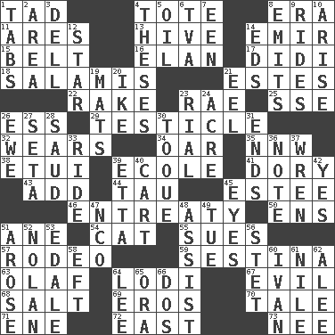 ACROSS 1. Small amount or degree 4. Carry 8. Epoch 11. Ancient Greek god of war 13. Hub of activity 14. Arab leader 15. Waist strap 16. Style 17. "You Light Up My Life" star Conn 18. Deli grouping 21. _____ Park, CO 22. Immoral or dissolute person 23. Actress Charlotte 25. Compass dir. 26. Double-curved letter 29. A testis 32. Erodes 34. Boat paddle 35. Compass dir. 38. Needle case 39. Learning spot: Fr. 41. Dinghy 43. Increase 44. The 19th letter of the Greek alphabet 45. First name in cosmetics 46. Plea 50. Followers of ems 51. One (Scot) 54. Domesticated feline 55. Institutes legal proceedings 57. Cowboy competition 59. French poetic form 63. Norwegian king 64. Farming town in central California 67. Tending to cause great harm 68. Table seasoning 69. Greek god of love 70. Falsehood 71. Compass dir. 72. Compass direction 73. Born DOWN 1. Bar bills 2. Type of rug 3. Small valley 4. College papers 5. Petroleum 6. Federal power corp. 7. Car or cant ending 8. Sends forth 9. Amusement-park features 10. Get up 12. Play the lead 14. Begley and Asner 19. Floor coverings 20. Eisenhower's nickname 21. Snakelike fish 23. Monetary unit of Yemen 24. Land measure 26. She-sheep 27. Bristle 28. Saudi Arabian king (1953-1964) 30. Woman's close-fitting hat 31. Extremities 33. Travel on or in a vehicle 36. Brief written record 37. Songbird 39. Singer James 40. Heavy open wagon 42. It is so 45. Snake ____ (dice throw) 47. Non-commissioned officer (abbr.) 48. Aid 49. Third day of the wk. 51. Came up 52. Pitcher Ryan 53. Peak District village in England 56. Proofreading order 58. Lizard (obsolete) 60. _ the terrible 61. The longest river in the world 62. Toward shelter 64. Area sheltered from the wind 65. Mouth or opening 66. Two (Sp.)