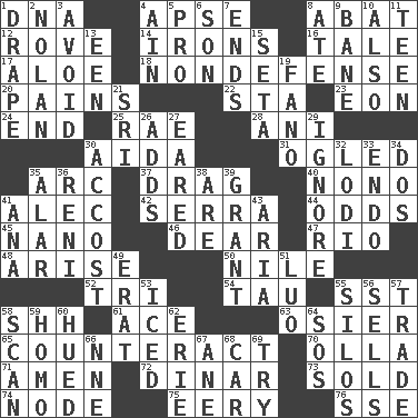 ACROSS 1. Heredity factor (abbr.) 4. Domed church section 8. Blind as ____ 12. Be footloose 14. Metal shackles 16. Falsehood 17. Medicinal plant 18. Unrelated to defense, as in spending 20. Aches 22. R.R. building 23. Age 24. Conclusion 25. Actress Charlotte 28. Cuckoo 30. Opera by Verdi 31. Stared 35. Curve 37. To trail on the ground 40. Words to Nanette 41. Actor Baldwin 42. Spanish missionary in California 44. Likelihood 45. Billionth: prefix 46. Letter starter 47. River (Sp.) 48. Get up 50. The longest river in the world 52. Three (prefix) 54. The 19th letter of the Greek alphabet 55. Fast jet (abbr.) 58. Quiet! 61. Adept person 63. Flexible twig of a willow tree 65. Frustrate 70. Water jar 71. So be it 72. Middle Eastern gold or silver currency 73. Disposed of to a purchaser 74. Thickened enlargement 75. Suggestive of the supernatural 76. Compass dir. DOWN 1. Window treatment 2. Pitcher Ryan 3. Prevent from happening 4. The 18th letter of the Arabic alphabet 5. Adept person 6. Boy, to dad 7. Extremities 8. Had dinner 9. Object of repulsion 10. In addition 11. Adolescent 13. Car or cant ending 15. Stalk of a moss capsule 19. Papal veil 21. _ Lanka 26. Sums up 27. Having ears or earlike features 29. Disregard 30. Buttonhole 32. Farming town in central California 33. Inside; within (prefix) 34. Two (Sp.) 35. Having or resembling wings 36. Painter Guido (1575-1642) 38. "We ___ not amused" (Victoria) 39. Let have 41. Santa ___, CA 43. Operatic vocal solo 49. Part of Q.E.F. 51. Nilotic language 53. On the rocks 55. Grain storage towers 56. Exchanges for money 57. Barter 58. Examine minutely or intensely 59. Same (prefix) 60. Took on color 62. 4th largest of the Great Lakes 64. Mayday 66. Compass dir. 67. One (Scot) 68. Auto 69. Attempt to accomplish something