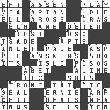 ACROSS 1. Newt 4. NE Netherlands city 9. Live dramatic performance 13. By way of 14. Bee-related 15. Hollow 16. Pipe bend 17. Came up 18. Mouths or openings 19. Shade tree 21. A saturated hydrocarbon 22. Prevent from occurring 24. Trial 26. Bear (Spanish) 27. Sadhe (variant) 29. Tenement units (abbr.) 30. An arm off of a larger body of water 31. Diluted with white 33. Viper 36. Sliced dessert 37. Responses 40. "Barney Miller" actor Jack 41. It is 42. Capri or Wright 43. Mexican monetary units 45. Collude with 47. Place in a line 48. Nervous spasm 49. Indian titles of respect 50. Marketplace scale 52. Make lace 54. And so on (abbr.) 56. Lick closed 57. Bert's buddy 59. Sandy's bark 61. To provide with a ceiling 62. Allots cards 63. Teachers' org. 64. Restaurants 65. Exchanges for money 66. "___ Little Indians" DOWN 1. Night before a holiday 2. Do some clerical work 3. Baron Munchausen's specialties 4. American Automobile Association (abbr.) 5. Small fatty European fish 6. The Jewish people; Israel 7. Relaxation 8. Compass dir. 9. Pictures 10. Old wives' tales, e.g. 11. Having or resembling wings 12. Affirmative reply 20. Ancient Persian 22. Drug addict 23. Eastern Standard Time (abbr.) 25. Stalk of a moss capsule 27. Native american tent (variation) 28. In a ____ (agitated or irritated) 29. Toward shelter 31. Inconspicuous attention getter 32. Leather borer 33. Aide 34. Within a short period 35. Introduce or present, as a question 38. Sibling's daughter 39. Practice fight 44. Writer Wiesel 45. Ringlike coral islands and reefs 46. Storage container 49. Free of sound 50. Adolescent 51. Precipitation 52. Woody plant 53. Of or related to the anus 55. Algonquian 56. _-fi 57. Begley and Asner 58. Double-curved letter 60. Avid follower