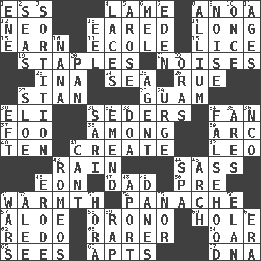 ACROSS 1. Curvy letter 4. Unable to walk 8. Small Philippine buffalo 12. Modern: prefix 13. Having ears or earlike features 14. Having great length 15. Merit 17. Learning spot: Fr. 18. Louse (plural) 19. Paper fasteners 21. Annoying sounds 23. _ tizzy (2 wds.) 24. Ocean 26. Regret 27. Comedian Laurel of Laurel & Hardy 28. Island territory of the United States 30. Connecticut Ivy Leaguer 31. Spring feasts 34. Avid follower 37. Egg _ yung 38. Amid 39. Curve 40. "___ Little Indians" 41. Cause to be 42. Lion 43. Water falling in drops from the sky 44. Backtalk 46. A really long time 47. June honoree 50. Before (prefix) 51. Heat 54. Flamboyance 57. Medicinal plant 58. U. of Maine site 60. Opening into or through something 62. Do over again 63. Less widely known 64. Boat paddle 65. Perceives with the eye 66. Tenement units (abbr.) 67. Heredity factor (abbr.) DOWN 1. Compass dir. 2. Oceans 3. Decision 4. Shoestrings 5. Came up 6. Cartoonist voice _ Blanc 7. Genesis locale 8. Plant genus of onion and garlic 9. Annoying sound 10. Single time 11. Eras 13. Snakelike fish 16. Nanny 20. Baking dish 22. Mouths or openings 25. Representative 27. _ gin 29. Goad 30. Newt 31. Indian skirt 32. Make improvements or corrections to 33. ___ good deed 34. It jiggles the polygraph 35. Ancient Greek god of war 36. Non-commissioned officer (abbr.) 41. Patter 43. Lover boys 44. Health resort 45. Bowlike part 46. Wear away 48. To the left, to Queeg 49. Natives or inhabitants of Denmark 51. Armed conflicts 52. Toward shelter 53. Israeli folk dance 55. And not 56. Enthusiasm 59. Hit sharply and swiftly 61. Epoch