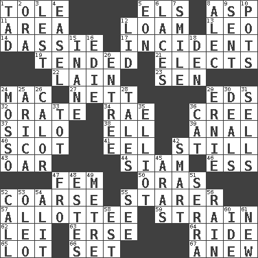 ACROSS 1. Lacquered or enameled metalware 5. Raised railways 8. Viper 11. Type of rug 12. Rich soil 13. Lion 14. Small ungulate mammals of Africa 17. Event 19. Looked after 21. Chooses 22. (Had) reclined 23. Elected rep. 24. Big _ 27. Remaining after all deductions 29. Begley and Asner 32. Speak pompously 34. Actress Charlotte 36. Algonquian 37. Grain storage tower 38. Pipe bend 39. Of or related to the anus 40. Native of Scotland 41. Snakelike fish 42. Not moving 43. Boat paddle 44. Thailand, formerly 46. Curvy letter 47. Opposite of masc. 50. Mouths or openings 52. Unrefined 55. A viewer who gazes fixedly 57. One to whom something is allotted 59. Put through a sieve 62. Flowery wreath 63. Celtic language 64. Travel on an animal 65. Car dealer's back yard 66. Put into a specified state 67. Afresh DOWN 1. Bit 2. Mouth or opening 3. For fear that 4. Artist's stand 5. Period of immesurable duration 6. Shoestrings 7. Grin 8. Actor Baldwin 9. Emitted 10. Cooking vessels 12. Flaplike covering 15. Silly 16. Singer Brickell 18. Lair 20. Main course 24. With motion or animation 25. N. Chile seaport 26. Bodily heat indicating an inflammation 28. Falsehoods 29. Bert's buddy 30. Allots cards 31. Makes a sale 33. Small child 35. American author Paul (1891-1958) 36. Feline 42. Don Adams' spy role 45. Caspian sea tributary 47. Back 48. _____ Park, CO 49. Distance measurement (Brit.) 51. Spanish missionary in California 52. Give a ring to 53. Margarine 54. Set down 55. Observe 56. Precipitation 58. Eastern Standard Time (abbr.) 60. Binary compound 61. ___ Haven, CT
