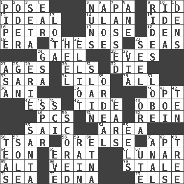 ACROSS 1. Airs 5. California wine valley 9. To free from 12. Perfect 14. ____ Bator, Mongolia 15. Binary compound 16. Stone: prefix 17. Olfactory organ 18. Lair 19. Period 20. College papers 23. Oceans 24. Highlander 25. Nights before holidays 27. Ripens 30. Raised railways 32. Expire 33. "Two Mules for Sister ____" 34. _ and Stitch 36. 100% 38. Black tropical American cuckoo 39. Rowing implement 40. Elect 43. Double-curved letter 46. Event that recurs at intervals 48. Mitch Miller's instrument 49. Personal Computers (abbr.) 51. Teachers' org. 52. It's straight from the horse's mouth 53. Ketch in the Levant 54. Type of rug 56. Russian ruler of old 58. Threatening words 61. Fitting 64. Age 65. Part of Q.E.F. 66. Type of eclipse 68. The first octave above the treble staff 69. Distinctive style or manner 70. Having lost freshness 71. Ocean 72. Pulitzer Prize-winning author Ferber 73. Otherwise DOWN 1. Corncob 2. Baltic tributary 3. Stalk of a moss capsule 4. Ewer handle 5. Religious women 6. _ vera 7. Went by 8. One (Scot) 9. Amusement-park features 10. It may be bright or harebrained 11. Lairs 13. Globular water bottle used in Asia 21. Person who is morally reprehensible 22. American author Paul (1891-1958) 23. Sew up the eyelids of hawks and falcons 24. Girls' org. (abbr.) 26. By way of 27. White ___ sheet 28. Separate the seeds from cotton 29. One of the Great Lakes 31. Killed 35. Severe or trying experience 37. Ear part 41. Luau course 42. "___ Little Indians" 44. Coast Guard woman 45. _-fi 47. Hearing organs 48. Mouth or opening 50. Tallied 53. Before Barbara or Clara 55. Snakelike fish 56. Beverages made from leaves 57. Flatfish 59. Precipitation 60. Inactive volcano in Sicily 61. Of or related to the anus 62. Friends 63. Woody plant 65. First lady 67. Shoshoni