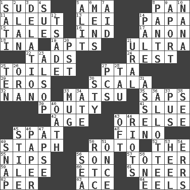 ACROSS 1. Soap bubbles 5. Nanny (var.) 8. Baking dish 11. Eskimo relative 13. Flowery wreath 14. Dad 15. Falsehoods 16. Indiana (abbr.) 17. At once, immediately (arch.) 18. _ tizzy (2 wds.) 19. Flats, for short 21. Extreme 22. Small amounts or degrees 24. Relief 25. Rest room 27. Parent Teacher Association (abbr.) 29. Greek god of love 30. Any of the three canals of the cochlea 32. Billionth: prefix 33. Taiwanese island in East China Sea 35. Plant excrements 39. Marked by pouting 41. Change direction abruptly 42. Ripen 43. Threatening words 45. Petty quarrel 48. Fine (Spanish) 49. Staphylococcus 50. Printing process, for short 52. Definite Article 55. Cuts off 56. Manchild 57. Carrier 59. Toward shelter 60. And so on (abbr.) 61. Scornful expression 62. For each 63. Adept person 64. Snakelike fish DOWN 1. Suttee (variant) 2. Uhlan (variant) 3. Accusation by an informer 4. Institute legal proceedings 5. Came down and settled, as after flight 6. Not women's 7. Help 8. Leg coverings 9. To the left, to Queeg 10. Nanny 12. Sadhe (variant) 14. Light colored 20. Pacific Standard Time (abbr.) 21. Mountain range 23. Columnist Joseph or Stewart 25. Nine, plus one 26. Mouth or opening 27. Personal Computers (abbr.) 28. The 19th letter of the Greek alphabet 30. Filthy place 31. NE Netherlands city 33. Large cup 34. Had dinner 36. One to whom something is allotted 37. Suppuration 38. Perceive with the eye 40. Pledge 43. Often (poetically) 44. Disturbances 45. Vertical member of a panel or frame 46. Some stationery 47. Domed church section 49. Fastener 50. College mil. group 51. Single time 53. The bottom of a shoe or boot 54. Blunders 56. Ocean 58. Single