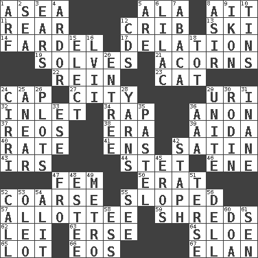 ACROSS 1. Toward the sea 5. Chicken ___ king 8. Small island 11. Tail end 12. Baby bed with high sides 13. What Jean-Claude Killy likes to do 14. Burden 17. Accusation by an informer 19. Finds the solution 21. Oak nuts 22. It's straight from the horse's mouth 23. Domesticated feline 24. Head covering 27. Municipality 29. RI univ. 32. An arm off of a larger body of water 34. Reproach for some lapse or misdeed 36. At once, immediately (arch.) 37. Vintage cars 38. Epoch 39. Opera by Verdi 40. Pace 41. Followers of ems 42. Smooth fabric 43. Big collection agency 44. Proofreading order 46. Compass dir. 47. Opposite of masc. 50. Part of Q.E.F. 52. Unrefined 55. Had an oblique or slanted direction 57. One to whom something is allotted 59. Tears up 62. Luau accessory 63. Celtic language 64. A type of plum 65. Car dealer's back yard 66. Greek goddess of the dawn 67. Liveliness DOWN 1. Sandy's bark 2. Ocean 3. Hearing organs 4. Zeal 5. "We ___ not amused" (Victoria) 6. Pale purple color 7. Phillipine bananalike plant 8. SW Saudi Arabia district 9. Visual representation of an object 10. Metal containers 12. Music discs 15. Opt 16. 57 in ancient Rome 18. Small child 20. Main course 24. High-altitude cloud 25. Approach 26. Ground plans 28. Tall tales 29. Join together 30. "The Thinker" sculptor 31. Lacking in sense or substance 33. Compass dir. 35. Soft color 36. American Automobile Association (abbr.) 42. Staphylococcus 45. Greek god of love 47. Back 48. First name in cosmetics 49. Paris' subway 51. Laconic 52. Give a ring to 53. Butter sub 54. Came down and settled, as after flight 55. Observe 56. Small valley 58. Double-curved letter 60. ___ good deed 61. Elected rep.