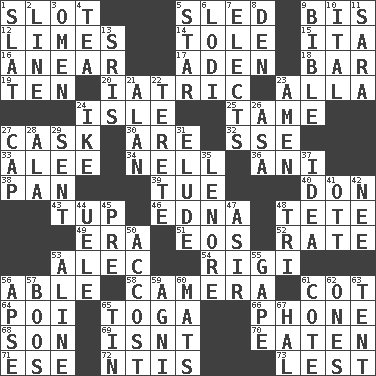 ACROSS 1. Narrow opening 5. Downhill vehicle 9. Again 12. Citrus fruits 14. Lacquered or enameled metalware 15. Call ___ day 16. Approach 17. An important port of Yemen 18. Drinking establishment 19. Nine, plus one 20. Of or pertaining to medicine 23. Silent film actress Nazimova 24. Small island 25. Docile 27. Keg 30. "We ___ not amused" (Victoria) 32. Compass dir. 33. Toward shelter 34. 1994 drama film starring Jodie Foster 36. Black tropical American cuckoo 38. Baking dish 39. Third day of the wk. 40. Spanish title 43. Uncastrated adult male sheep 46. Pulitzer Prize-winning author Ferber 48. False hair 49. Period 51. Greek goddess of the dawn 52. Pace 53. Actor Baldwin 54. Swiss mountan, "Queen of the Mountains" 56. Competent 58. Device for capturing images 61. Small bed 64. Luau course 65. Ancient Roman robe 66. Give a jingle 68. Boy, to dad 69. Is not 70. Ingested 71. Compass dir. 72. Nuclear Threat Initiatives 73. For fear that DOWN 1. Narrow board 2. Actor's bit 3. Sign of things to come 4. Afternoon social gathering 5. Play the lead 6. Farming town in central California 7. Opts 8. Lair 9. God's Word 10. Slanted text style (abbr.) 11. "Two Mules for Sister ____" 13. Indian titles of respect 21. Actor Alda or Thicke 22. Cylindrical with tapered ends 23. So be it 24. Eisenhower's nickname 26. White ___ sheet 27. Head covering 28. Insect wing 29. Emitted 31. Dodge 35. Poe poem 37. The main thing one is thinking about 41. Baseball player Mel 42. Born 44. Ubangi River tributary 45. Before (prefix) 47. SW Saudi Arabia district 48. Three (prefix) 50. Buttonhole 53. Place in a line 55. Open wide 56. Domed church section 57. Scornful sounds 59. Hindu god of fire 60. Floor protectors 61. ____ d'Azur (French Riviera) 62. Washington bills 63. Portable shelter 65. Shallow baking pan 67. Actor Linden