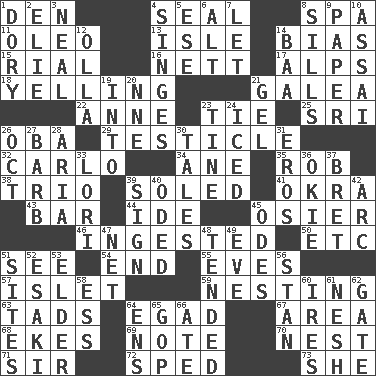 ACROSS 1. Lair 4. Lick closed 8. Health resort 11. Margarine 13. Capri or Wright 14. Prejudice 15. Monetary unit of Yemen 16. Remaining after all deductions 17. High mountains 18. Crying or shouting loudly 21. An organ shaped like a helmet 22. Queen of England 1702-14 23. Make a knot 25. Indian title of respect (Mr.) 26. Chief or king in Benin or Nigeria 29. One of the two male reproductive glands 32. Monte _, Las Vegas Hotel/Casino 34. One (Scot) 35. Director Reiner 38. Musical group of three 39. Having a sole or soles 41. Gumbo ingredient 43. Oblong piece of solid material 44. Binary compound 45. Flexible twig of a willow tree 46. Eaten 50. And so on (abbr.) 51. Perceive with the eye 54. Conclusion 55. Nights before holidays 57. Small island 59. Snuggling 63. Bits 64. Mild oath 67. Length times width 68. Makes supply last 69. Brief written record 70. Egg locale 71. Title for a knight 72. Drove too fast 73. A female animal or person DOWN 1. Small, narrow, flatbottom fishing boat 2. Writer Wiesel 3. Be tempered by heat 4. Burns superficially 5. Compass dir. 6. Keyboard modifier key 7. Allow 8. Beverly of Met fame 9. Some stationery 10. Slender Brazilian palm 12. Rounded earthenware pot or jar 14. Sound made by sheep 19. To the inside or interior of 20. Compass dir. 21. Set 23. Prong on a fork 24. On the rocks 26. Sep. follower 27. Sharp remark 28. Roberta Peters solo 30. Lies 31. Greek god of love 33. Australian parrot (variant) 36. Migrant worker of the '30s 37. Cy Young winner Saberhagen 39. Signal 40. Wrote a lyric poem 42. Curve 45. Lyric poems 47. Fish or hair follower 48. Looked after 49. Night before a holiday 51. Locates 52. 1973 Nobel Price Winner (Physics) Leo 53. A person who is older than you are 56. Comedian Laurel of Laurel & Hardy 58. Double-curved letter 60. Angers 61. Soft 62. Yard entry 64. Followers of ems 65. Grand Old Party 66. Had dinner