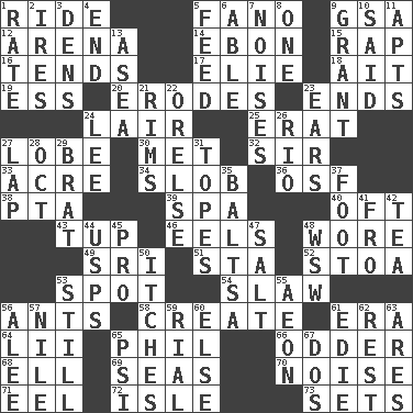 ACROSS 1. Travel on an animal 5. Papal veil 9. Girls' org. (abbr.) 12. Sports stadium 14. Inky black, to poets 15. Reproach for some lapse or misdeed 16. Watches over 17. Writer Wiesel 18. Small island 19. Curvy letter 20. Eats (away) 23. Conclusions 24. Den 25. Part of Q.E.F. 27. Ear part 30. Was introduced to 32. Title for a knight 33. 1/640 square mile 34. Oscar Madison type 36. Order of Saint Francis (abbr.) 38. Parent Teacher Association (abbr.) 39. Health resort 40. Often (poetically) 43. Uncastrated adult male sheep 46. Snakelike fish 48. Had on 49. Indian title of respect (Mr.) 51. R.R. building 52. Portico 53. Specific locale 54. Cole _ (cabbage dish) 56. Pismires 58. Make 61. Period 64. Cards in a Roman deck? 65. Silvers or Donahue 66. More peculiar 68. Pipe bend 69. Oceans 70. Annoying sound 71. Snakelike fish 72. Small island 73. Puts into a specified state DOWN 1. Pace 2. Angers 3. Habitations of wild animals 4. Conclude 5. Nourish 6. Competent 7. Annoying sounds 8. Single 9. Let have 10. Alleged 11. Tenement units (abbr.) 13. Toward the sea 21. Basketball hoops 22. Threatening words 23. Hearing organs 24. Area sheltered from the wind 26. River (Sp.) 27. Pet locale 28. Sep. follower 29. Naughty child 31. Drinks excessively 35. Greek mezzo-soprano Agnes 37. 12 inches 41. Away 42. Afternoon social gathering 44. United States Postal Service (abbr.) 45. Adept person 47. Table seasoning 48. Compass dir. 50. Skin irritations 53. Free from disturbance or agitation 55. A really long time 56. Toward shelter 57. Mediterranean tributary 59. Monetary unit of Yemen 60. Otherwise 61. Singer Brickell 62. Repose 63. Ancient Greek god of war 65. 23rd letter of the Greek alphabet 67. Two (Sp.)