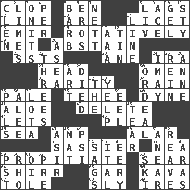 ACROSS 1. Hoof sound 5. Benjamin's nick name 8. Falls behind 12. Welles in "The Third Man" 13. "We ___ not amused" (Victoria) 14. It is permitted: Lat. 15. Independent ruler or chieftain 16. Happening in regular succession 19. Was introduced to 20. Choose not to consume 21. Fast planes 23. A saturated hydrocarbon 24. Retirement account (abbr.) 27. Froth on beer 30. Sign of something about to happen 31. Noteworthy scarcity 34. Precipitation 35. Light colored 38. Giggle 40. Centimeter-gram-second unit of force 41. Medicinal plant 42. Keyboard key 44. Allows 45. Entreaty 46. Ocean 47. Electrical Unit 50. Having or resembling wings 53. More disrespectful 57. Teachers' org. 59. Appease 63. Wither 64. Bake eggs in their shells 65. Slender fish 66. Polynesian shrub of the pepper family 67. Lacquered or enameled metalware 68. Wily 69. Angers DOWN 1. To starve (Brit.) 2. Citrus fruits 3. Leaves out 4. For each 5. Sharp remark 6. Greek god of love 7. Remaining after all deductions 8. 54 in ancient Rome 9. Adept person 10. Set 11. Filthy place 14. Actor's bit 17. American Automobile Association (abbr.) 18. Metal container 20. At sea 22. Trios 24. "If ____ say so..." 25. It's straight from the horse's mouth 26. Singer Murray 28. Tate display 29. Passed on 30. Severe or trying experience 32. Definite Article 33. Sharp bark 35. Friends 36. Toward shelter 37. Globular water bottle used in Asia 39. Snakelike fish 43. Pull into pieces 47. SW Saudi Arabia district 48. Floor protector 49. Air pressure measure (abbr.) 51. Approach 52. Break or tear apart 54. Sinks 55. Slanted text style (abbr.) 56. Suggestive of the supernatural 58. Ancient river in northeast Turkey 59. Pacific Standard Time (abbr.) 60. 17th letter of the Greek alphabet 61. Lubricate 62. Before (prefix) 63. What Jean-Claude Killy likes to do