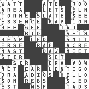 ACROSS 1. Electrical Unit 5. Had dinner 8. Friend of Pooh 11. Length times width 12. Allows 14. Shade tree 15. Singer Mel 17. Schedule 18. Perceive with the eye 19. Substance 21. Hit sharply and swiftly 22. Electrically charged atom 23. To riddle 24. Unit of force equal to gravity 25. Bit 27. To free from 28. Puts into a specified state 31. Pile 35. Directed 37. In a ____ (agitated or irritated) 38. Celtic language 39. Actress Charlotte 41. 43,560 square feet 42. Vertical spar for supporting sails 43. Obsolete 45. Rendezvous 46. Use a swizzle stick 47. Arrange properly for use 49. Title for a knight 51. Period 52. Solemn pledge 55. Fish or hair follower 57. Ewer handle 60. Small, flat, pigmented spot on the skin 62. Mouth or opening 63. Goodbye (Sp.) 65. Phone greeting 66. Male child 67. Confederate soldiers (slang) 68. Downhill vehicle 69. Eastern Standard Time (abbr.) 70. Science/research agcy. 71. Bits DOWN 1. Wetness 2. Came up 3. Laconic 4. Not wild 5. Everything 6. Pull apart 7. Singer James 8. Dwelling 9. Margarine 10. Sign of things to come 13. Back-to-school mo. 16. Engineer (abbr.) 17. Sowing specialist 20. To provide with a ceiling 26. Indian state 29. Become fatigued 30. Proofreading order 31. Cloth borders 32. Part of Q.E.F. 33. Aide 34. _ dish (used to culture cells) 36. Male parent 40. Artist's stands 44. We are 48. Hyperbolic tangent 50. Located in or toward the back 52. Country residence 53. Stared at amorously 54. Forest 55. Characteristic smell of wine 56. Greek god of love 58. An important port of Yemen 59. Teases 61. Trial 64. Order of Saint Francis (abbr.)