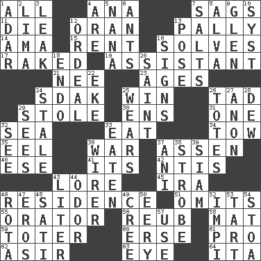 ACROSS 1. 100% 4. Santa ___, CA 7. Sinks 11. Pass on 12. NW Algerian seaport 13. Friendly 14. Housemaid (var.) 15. Monthly bill 16. Finds the solution 17. Moved through 19. Helper 21. Born 23. Matures 24. Neighbor of Neb. 25. Victory 26. Small amount or degree 29. Fur scarf 30. Followers of ems 31. Single 32. Ocean 33. Erode 34. Pull behind 35. Snakelike fish 36. Armed conflict 37. NE Netherlands city 40. Compass dir. 41. It is 42. Nuclear Threat Initiatives 43. Old wives' tales, e.g. 45. Retirement account (abbr.) 46. Home 51. Leaves out 55. Speaker 56. Reuben's nickname 58. Floor protector 59. Carrier 60. Celtic language 61. Adept person 62. SW Saudi Arabia district 63. Sight organ 64. Call ___ day DOWN 1. The sixth month of the Jewish calendar 2. Pale green bean 3. Path through which fluid escapes 4. "We ___ not amused" (Victoria) 5. Nanny 6. Pismires 7. Table seasonings 8. Inventor's middle name 9. Small, secluded valley 10. System (abbr.) 12. Severe or trying experience 13. Introduce or present, as a question 16. Public displays of written messages 18. Inside; within (prefix) 20. Inhabitant of Heaven 22. Make supply last 24. Having lost freshness 25. Puts on (as clothing) 26. Lugs 27. Soon (poet.) 28. Morning condensation 29. Observes 32. Observe 33. Eroded 36. One who wires 37. Black tropical American cuckoo 38. Disco prop 39. Thailand, formerly 43. 61 cubic inches 44. Scent 46. Round or rotation of duties 47. Greek god of love 48. Suttee (variant) 49. Algonquian 50. Suggestive of the supernatural 52. Body of Kaffir warriors 53. Small pie 54. Portico 57. Purpose