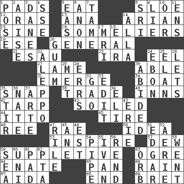 ACROSS 1. Writing tablets 5. Ingest 8. A type of plum 12. Mouths or openings 13. Santa ___, CA 14. Believer in; advocate of (suffix) 15. Trig term 16. Wine waiters 19. Compass dir. 20. Commissioned military rank 21. Son of Isaac 23. Retirement account (abbr.) 24. Snakelike fish 27. Unable to walk 30. Competent 31. Develop 34. Water vessel 35. Fastener 38. Swap 40. Taverns 41. Canvas cover 42. Dirtied 44. "Tell ____ the Marines!" 45. Become fatigued 46. Portuguese money of account (variant) 47. Actress Charlotte 50. The main thing one is thinking about 53. Heighten or intensify 57. Morning condensation 59. Supplementary 63. Legendary monster 64. Related on the mother's side 65. Baking dish 66. Precipitation 67. Opera by Verdi 68. Conclusion 69. Cy Young winner Saberhagen DOWN 1. Airs 2. Originate 3. Natives or inhabitants of Denmark 4. Compass dir. 5. Comfort 6. At once, immediately (arch.) 7. Not wild 8. Indian title of respect (Mr.) 9. Falsehood 10. Boat paddle 11. Followers of ems 14. Silent film actress Nazimova 17. Medical imaging device (abbr.) 18. Hearing organ 20. Island territory of the United States 22. City in Syria 24. Inky black, to poets 25. Liveliness 26. Allows 28. Was introduced to 29. Blunders 30. Remained 32. E Mali city 33. Prepare for publication 35. Disorderly outburst 36. Nathan's nickname 37. Johnson of "Laugh-In" 39. Biblical high priest 43. One of the Great Lakes 47. Cause heat under the collar 48. A saturated hydrocarbon 49. Eastern Standard Time (abbr.) 51. _ Allan Poe 52. Nest on high 54. Corncob 55. _ the terrible 56. Tear apart 58. Left 59. Ocean 60. University (slang) 61. Writing tablet 62. Parent Teacher Assoc. 63. Globe