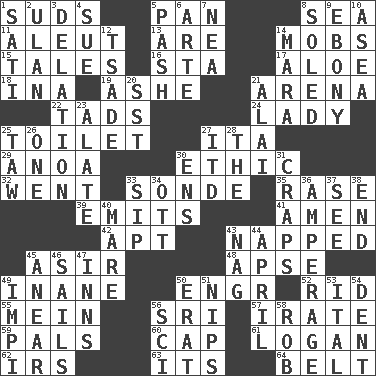 ACROSS 1. Beer foam 5. Baking dish 8. Ocean 11. Native American of Southwest Alaska 13. "We ___ not amused" (Victoria) 14. Crowds into 15. Falsehoods 16. R.R. building 17. _ vera 18. _ tizzy (2 wds.) 19. American tennis player Robert 21. Sports stadium 22. Small amounts or degrees 24. Kenny Rogers chart-topper in '80 25. Bathroom 27. Call ___ day 29. Small Philippine buffalo 30. Moral principle 32. Gone 33. Something which is sent 35. To erase 39. Gives off 41. So be it 42. Fitting 43. Slept 45. SW Saudi Arabia district 48. Domed church section 49. Empty; void 50. Engineer (abbr.) 52. To free from 55. Count _ (2 wds.) 56. _ Lanka 57. Feeling or showing extreme anger 59. Friends 60. Head covering 61. Utah city north of Ogden 62. Big collection agency 63. ___ a Wonderful Life 64. Waist strap DOWN 1. Suttee (variant) 2. ____ Bator 3. Conveyance 4. Take to court 5. Romantic infatuation 6. Johnson of "Laugh-In" 7. Teachers' org. 8. Having a sole or soles 9. Dark wood 10. At sea 12. Sadhe (variant) 14. Hindu Mythology: god of death 20. Fast jet (abbr.) 21. Jai _ 23. Having winglike extensions 25. The 23rd letter of the Hebrew alphabet 26. Single 27. It would 28. Definite Article 30. Followers of ems 31. Dice game 33. Small drink 34. Baseball player Mel 36. Electrical Measurement 37. Observe 38. Conclusion 40. Female horse 43. Tired old horse 44. Showery time 45. Approach 46. Moves on water 47. Taverns 49. Body of Kaffir warriors 50. Part of Q.E.F. 51. Pinches, bites 53. Slanted text style (abbr.) 54. Gouge 56. _-fi 58. Director Reiner