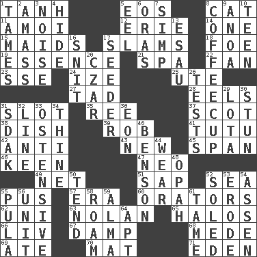 ACROSS 1. Hyperbolic tangent 5. Greek goddess of the dawn 8. Domesticated feline 11. Mine, in Marseilles 12. 4th largest of the Great Lakes 14. Single 15. Women servants 17. Hits or strikes with great force 18. Enemy 19. Substance 21. Health resort 22. Avid follower 23. Compass dir. 24. Ending with capital 25. Shoshoni 27. Small amount or degree 28. Snakelike fish 31. Narrow opening 35. To sift 37. Highlander 38. Food container 39. Director Reiner 41. Ballerina skirt 42. Against 43. ___ Haven, CT 45. Connect, as a bridge 46. Peachy ____! 47. Modern: prefix 49. Fish or hair follower 51. Plant excrement 52. Ocean 55. Fluid product of inflammation 57. Period 60. Speakers 62. Single; one (prefix) 63. Pitcher Ryan 65. Rings 66. 54 in ancient Rome 67. Moist 68. Ancient Persian 69. Had dinner 70. Floor covering 71. Genesis locale DOWN 1. Softens 2. Collect or gather 3. Annoying sound 4. Flintstone garb 5. Snakelike fish 6. Mouths or openings 7. Simple or foolish person 8. Java holder (2 wds.) 9. Small Philippine buffalo 10. Adolescent 13. He sold his birthright 16. In a ____ (agitated or irritated) 17. Sowing specialist 20. Russian ruler of old 26. Trials 29. Globular water bottle used in Asia 30. Astound 31. Neighbor of Neb. 32. Actor's bit 33. Clearly or manifestly demonstrative 34. One or ones belonging to thee 36. A really long time 40. Gillaume's butler role 44. Put on (as clothing) 48. Brightly colored fish 50. Look after 52. Having a sole or soles 53. Wear away 54. NE Netherlands city 55. Monetary unit of Botswana 56. A single undivided whole 58. Wander aimlessly 59. _ mater 61. Not wild 64. Fitting
