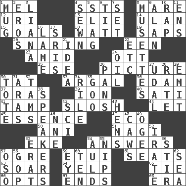 ACROSS 1. Cartoonist voice _ Blanc 4. Fast planes 8. Female horse 12. RI univ. 13. Writer Wiesel 14. Uhlan (variant) 15. Finish lines 18. Electrical Unit 19. Plant excrements 20. Catching in a trap 22. Car or cant ending 23. Among 24. Baseball player Mel 25. Compass dir. 26. Photo 30. Make lace 33. Therefore, facetiously 36. Dutch treat 37. Mouths or openings 39. Electrically charged atom 40. Suttee (variant) 41. Pack (down) 42. Agitate, as a liquid 44. Allow 45. Substance 47. Environmental prefix 50. Cuckoo 51. Wise men 53. Supplement with great effort 54. Replies 57. Legendary monster 59. Needle case 61. Theater features 63. Fly high 64. Sharp bark 65. Make a knot 66. Chooses 67. Extremities 68. Period DOWN 1. Large cup 2. Greek god of love 3. Climbing, woody, usually tropical vines 4. Stitched 5. Volcanic refuse 6. Teat (slang) 7. Arrange properly for use 8. French bagpipes 9. Actor Alda or Thicke 10. Hit sharply and swiftly 11. Followers of ems 16. Unable to walk 17. Indian titles of respect 21. It may be bright or harebrained 22. And so on (abbr.) 24. Lubricate 26. Baking dishes 27. Hereditary estate 28. Assign a rank or rating to 29. Send forth 30. Carryall 31. Ancient river in northeast Turkey 32. Scottish caps 34. Cause heat under the collar 35. Thick or sticky substance 38. Orators 42. _-fi 43. Is hesitant and indecisive 46. Compass dir. 48. Crow sounds 49. Double curve, resembling the letter S 52. Feeling or showing extreme anger 53. Part of Q.E.F. 54. Old (Scot.) 55. Pinches, bites 56. Commotion 57. Bear (Spanish) 58. Grand Old Party 59. Sight organ 60. "___ Little Indians" 62. Ocean