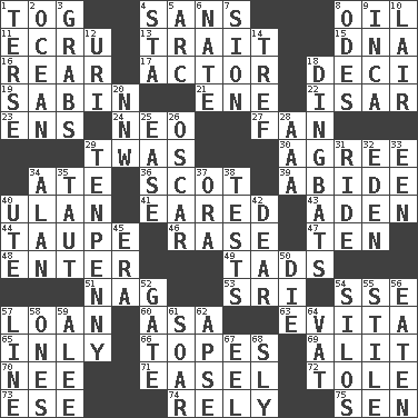 ACROSS 1. Coat; cloak 4. Without 8. Lubricate 11. Shade of tan 13. Distinguishing feature 15. Heredity factor (abbr.) 16. Posterior 17. Thespian 18. Tenth: prefix 19. Unit of acoustic absorption 21. Compass dir. 22. Austrian river, tributary to the Danube 23. Followers of ems 24. Modern: prefix 27. Air blower 29. It was, poetically 30. Match 34. Had dinner 36. Highlander 39. Remain 40. ____ Bator 41. Having ears or earlike features 43. An important port of Yemen 44. Grayish beige 46. To erase 47. "___ Little Indians" 48. Keyboard key 49. Bits 51. Tired old horse 53. Indian title of respect (Mr.) 54. Compass dir. 57. Grant temporary use of 60. White ___ sheet 63. Webber/Rice musical 65. In an inward manner 66. Drinks excessively 69. Came down and settled, as after flight 70. Born 71. Artist's stand 72. Lacquered or enameled metalware 73. Compass dir. 74. Have confidence or faith in 75. Elected rep. DOWN 1. Laconic 2. Sea 3. Takes hold of 4. R.R. building 5. Curve 6. Nathan's nickname 7. The Jewish people; Israel 8. Lyric poems 9. South American Indian 10. Den 12. RI univ. 14. Not kosher 18. Empty-headed or silly people 20. Compass dir. 25. Comfort 26. Witty Wilde 28. American Automobile Association (abbr.) 29. 3-inch nail 31. Travel on or in a vehicle 32. Genesis locale 33. Car or cant ending 34. ____ Jay Lerner 35. Drawn tight 37. Mouth or opening 38. Trials 40. Shoshoni 42. Letter starter 45. Epoch 50. Expire 52. Yard entry 54. Grain storage towers 55. Vertical member of a panel or frame 56. Eroded 57. Actor's bit 58. Washington bills 59. Toward shelter 61. Fly high 62. Domed church section 64. Large container 67. Snakelike fish 68. Roguish