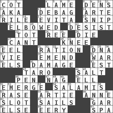 ACROSS 1. Small bed 4. Unable to walk 8. Hiding places for outlaws 12. Alias (abbr.) 13. Debunk (Brit. slang) 14. Johnson of "Laugh-In" 15. Cause heat under the collar 17. Webber/Rice musical 18. Clip 19. Turned at an angle; bent 21. Cease 23. Small child 24. To sift 26. Pass on 27. Patter 28. Leg joint 30. Snakelike fish 31. Food allowance for one day 34. Heredity factor (abbr.) 37. Compete 38. Make improvements or corrections to 39. Armed conflict 40. Raised railways 41. Break 42. Eastern Standard Time (abbr.) 43. Pacific island yam 44. Table seasoning 46. Animal enclosure 47. Tired old horse 50. Pipe bend 51. Develop 54. Deli grouping 57. To erase 58. Nick name for Arthur 60. Queen of England 1702-14 62. Position in a hierarchy or organization 63. Moves on water 64. Slender fish 65. Otherwise 66. Suggestive of the supernatural 67. Health resort DOWN 1. 4-wheeled motor vehicle 2. Migrant worker of the '30s 3. Baron Munchausen's specialties 4. Crowbar 5. Tolerate 6. Floor protector 7. Mild oath 8. Small ungulate mammals of Africa 9. Bert's buddy 10. Nuclear Threat Initiatives 11. Back-to-school mo. 13. Morning condensation 16. Inky black, to poets 20. Baseball player Mel 22. Paradise 25. Supplementing with great effort 27. To provide with a ceiling 29. Connecting point 30. Night before a holiday 31. Buttocks 32. ID or VA city 33. Beverage made from leaves 34. Residences 35. Political cartoonist Thomas 36. Nonscientific branch of learning 41. Mild oath, euphamism for damn 43. Cigar-shaped 44. Ocean 45. _ mater 46. Mexican monetary units 48. Moving about 49. Lightheartedly 51. Celtic language 52. Shopping center 53. Relaxation 55. French article 56. Fastener 59. Actress Charlotte 61. Period