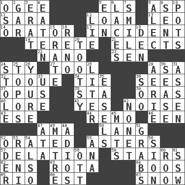ACROSS 1. Double curve, resembling the letter S 5. Raised railways 8. Viper 11. "Two Mules for Sister ____" 12. Rich soil 13. Lion 14. Speaker 17. Happening 19. Cylindrical with tapered ends 21. Opts 22. Billionth: prefix 23. Elected rep. 24. Filthy place 27. Implement 29. White ___ sheet 32. Woman's close-fitting hat 34. Standoff 36. Perceives with the eye 37. Musical composition 38. R.R. building 39. Mouths or openings 40. Old wives' tales, e.g. 41. Consenting reply 42. Annoying sound 43. Compass dir. 44. San ____ (Riviera town) 46. Car or cant ending 47. Housemaid (var.) 50. Long (Scottish) 52. Spoke pompously 55. Michaelmas daisies 57. Conveyance 59. Flight of steps 62. Followers of ems 63. Roll call or roster of names 64. Expressions of contempt or scorn 65. _ de Janeiro 66. Eastern Standard Time (abbr.) 67. Overwhelm DOWN 1. Bear (Spanish) 2. Slender fish 3. Part of Q.E.F. 4. Ingested 5. Period of immesurable duration 6. Shoestrings 7. Grin 8. Actor Baldwin 9. Posted 10. Cooking vessels 12. Falsehood 15. Speak pompously 16. Former U.S. Attorney General Janet 18. Lair 20. A girl or young woman (variant) 24. Took without asking 25. Traditional theme or motif 26. You are 28. 61 cubic inches 29. Nest on high 30. Gospel singer Marvin 31. NE Netherlands city 33. Purpose 35. Artist's stands 36. "Barney Miller" actor Jack 42. Music written for nine 45. Floor coverings 47. "One Day ___ Time" 48. Distance measurement (Brit.) 49. Goodbye (Sp.) 51. Seizes 52. River in Europe 53. Painter Guido (1575-1642) 54. In addition 55. Santa ___, CA 56. The Jewish people; Israel 58. Baseball player Mel 60. Friend of Pooh 61. Compass dir.