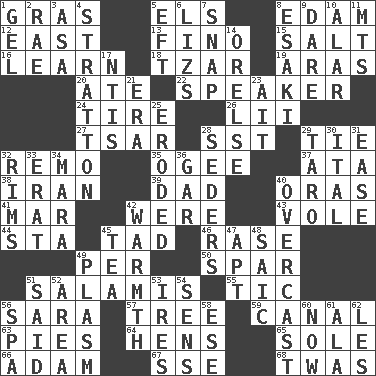 ACROSS 1. Pate de foie ____ 5. Raised railways 8. Dutch treat 12. Compass direction 13. A pale, very dry sherry 15. Table seasoning 16. Acquire or gain knowledge or skills 18. Russian ruler 19. Caspian sea tributary 20. Had dinner 22. Orator 24. Hoop that covers a wheel 26. Cards in a Roman deck? 27. Russian ruler of old 28. Fast jet (abbr.) 29. Standoff 32. San ____ (Riviera town) 35. Double curve, resembling the letter S 37. "One Day ___ Time" 38. SW Asia republic 39. June honoree 40. Mouths or openings 41. Third mo. 42. Past tense of be (plural) 43. Short-tailed, large-bodied rat 44. R.R. building 45. Small amount or degree 46. To erase 49. For each 50. Coast Guard woman 51. Deli grouping 55. Nervous spasm 56. "Two Mules for Sister ____" 57. Family _ (genealogy) 59. Lessep's creation 63. Sliced desserts 64. Coop moms 65. Not divided or shared with others 66. First man 67. Compass dir. 68. It was, poetically DOWN 1. Set 2. Actress Charlotte 3. White ___ sheet 4. Ski resort town in Vermont 5. Newt 6. Belonging to Elizabeth 7. Fastener 8. 1973 Nobel Price Winner (Physics) Leo 9. Have the gumption 10. Having or resembling wings 11. Mountains (abbr.) 14. Threatening words 17. Nuclear Threat Initiatives 21. Epoch 23. Small island 25. Eaten away 28. Spring feasts 29. Edible starchy tuberous root 30. Slanted text style (abbr.) 31. Relaxation 32. Basketball hoops 33. Part of Q.E.F. 34. Hindu Mythology: god of death 36. Slender fish 40. Cloudy 42. Heat 45. Beverage made from leaves 47. Fitting 48. Ketch in the Levant 49. Suffix with ecto or cyto 51. Expressed in words 52. Length times width 53. Angers 54. Elected reps. 56. Health resort 58. Compass dir. 60. Immediately 61. Chicken ___ king 62. French article
