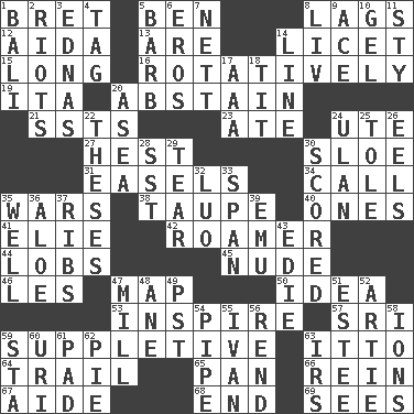 ACROSS 1. Cy Young winner Saberhagen 5. Benjamin's nick name 8. Fails to keep up a pace 12. Opera by Verdi 13. "We ___ not amused" (Victoria) 14. It is permitted: Lat. 15. Having great length 16. Producing rotation 19. Call ___ day 20. Choose not to consume 21. Fast planes 23. Had dinner 24. Shoshoni 27. Behest 30. _ gin 31. Artist's stands 34. Give a ring to 35. Armed conflicts 38. Grayish beige 40. Singles 41. Writer Wiesel 42. Nomad 44. Tennis shots 45. Unadorned 46. French article 47. Atlas unit 50. It may be bright or harebrained 53. Motivate 57. Indian title of respect (Mr.) 59. Supplementary 63. "Tell ____ the Marines!" 64. Go after with the intent to catch 65. Baking dish 66. It's straight from the horse's mouth 67. Assistant 68. Conclude 69. Perceives with the eye DOWN 1. Indonesian resort city 2. Disturbances 3. Ferber et al. 4. Label 5. Sharp remark 6. Greek god of love 7. Remaining after all deductions 8. 54 in ancient Rome 9. Adept person 10. Set 11. Filthy place 14. Actor's bit 17. Auto club (abbr.) 18. Teat (slang) 20. Toward the sea 22. College papers 24. ____ Bator 25. Lacquered or enameled metalware 26. Snakelike fish 28. Fast jet (abbr.) 29. Lacerate 30. Tallied 32. Nilotic language 33. Connect, as a bridge 35. Not ill 36. Medicinal plant 37. Teases 39. Australian flightless bird 43. Singer Brickell 47. Place where flour is made 48. One (Scot) 49. Pacific Standard Time (abbr.) 51. First name in cosmetics 52. Nick name for Arthur 54. Corncob 55. "Terrible" tsar 56. Tear apart 58. Charged atoms 59. R.R. building 60. RI univ. 61. Groovy apt. 62. Sliced dessert 63. Big collection agency