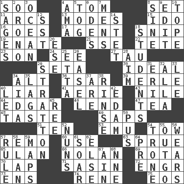 ACROSS 1. "Barney Miller" actor Jack 4. Smallest unit of an element 8. Arrange properly for use 11. Curves 13. Methods 15. Wedding promise 16. Moves 17. Representative 18. Sever or remove by pinching or nipping 19. Related on the mother's side 21. Compass dir. 22. False hair 23. Manchild 24. Observe 27. The 19th letter of the Greek alphabet 29. Bristle 30. Perfect 34. The first octave above the treble staff 36. Russian ruler of old 39. Haggard of country music 40. One who doesn't tell the truth 41. Nest on high 43. Mediterranean tributary 44. _ Allan Poe 46. Grant temporary use of 47. Afternoon social gathering 48. Clothes sense 49. Plant excrements 51. Nine, plus one 53. Australian flightless bird 54. Pull behind 57. San ____ (Riviera town) 60. Purpose 63. Disorder 65. ____ Bator 66. Pitcher Ryan 69. Round or rotation of duties 70. Infant locale 71. Indian antelope 72. Engineer (abbr.) 73. Followers of ems 74. French philosopher Descartes 75. Greek goddess of the dawn DOWN 1. Gurus 2. U. of Maine site 3. Sea 4. Nanny (var.) 5. Coat; cloak 6. Lyric poems 7. Not women's 8. Trig term 9. Prepare for publication 10. Drink excessively 12. Fast jet (abbr.) 14. Proofreading order 18. SAT takers 20. Compass dir. 25. Singer James 26. Artist's stand 28. Direct toward a target or goal 29. Ski resort town in Vermont 31. 4th largest of the Great Lakes 32. Silent film actress Nazimova 33. Area sheltered from the wind 34. Opera by Verdi 35. Fails to keep up a pace 37. "We ___ not amused" (Victoria) 38. Remove soap 40. Allow 42. Dutch treat 45. Portuguese money of account (variant) 50. Tenth month of the Hindu calendar 52. Religious women 54. Heavy duty weighing machine 55. Outlay 56. Puts on (as clothing) 57. General guideline 58. Style 59. Atlas contents 61. Fly high 62. Otherwise 64. Before (prefix) 67. The 18th letter of the Arabic alphabet 68. Compass dir.