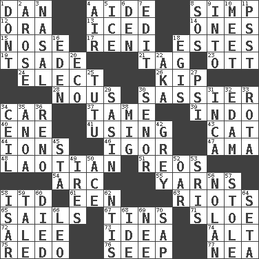 ACROSS 1. Daniel's nick name 4. Assistant 8. Simple or foolish person 12. Mouth or opening 13. On the rocks 14. Singles 15. Sense of smell 17. Painter Guido (1575-1642) 18. _____ Park, CO 19. Sadhe (variant) 21. Label 23. Baseball player Mel 24. Voters do this 26. Monetary unit of Laos 28. Horse sense 30. More disrespectful 34. Auto 37. Not wild 39. Southeast Asian peninsula 40. Compass dir. 41. Exploiting 43. Feline 44. Charged particles 46. Russian composer Stravinsky 47. Housemaid (var.) 48. Of or relating to Laos or its people 51. Vintage cars 54. Curve 55. Tall tales 58. It would 61. Car or cant ending 63. Debaucheries 65. Moves on water 67. Airtight sealed metal containers 71. _ gin 72. Toward shelter 73. The main thing one is thinking about 74. Keyboard modifier key 75. Do over again 76. Ooze 77. Teachers' org. DOWN 1. Do not 2. Came up 3. Relating to the nose 4. Atmosphere 5. Frozen water 6. Lair 7. Prepare for publication 8. Distress signal 9. To the inside or interior of 10. Confront 11. Inconspicuous attention getter 16. Paradise 18. The front part of a cuirass 20. Environmental prefix 22. Alias (abbr.) 25. Ballerina skirt 27. Air pressure measure (abbr.) 29. Indian antelope 30. Sir (Sp.) 31. South American Indian 32. Dutch treat 33. Roll call or roster of names 34. To provide with a ceiling 35. Small Philippine buffalo 36. Former U.S. Attorney General Janet 38. Russian fighter aircraft 42. Jennifer or Joel 45. R.R. building 49. Angers 50. Adept person 52. Rowing implement 53. Indian titles of respect 56. Pitcher Ryan 57. Took without asking 58. Austrian river, tributary to the Danube 59. Lie 60. Passed on 62. Nuclear Threat Initiatives 64. Stalk of a moss capsule 66. Lion 68. Binary compound 69. Born 70. Plant excrement