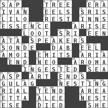ACROSS 1. Plant excrement 4. Family _ (genealogy) 8. Epoch 11. "Terrible" tsar 13. Snakelike fish 14. Indian titles of respect 15. _ and Stitch 16. Relief 17. Restaurants 18. Substance 21. Get up 22. Spoils 23. Indian title of respect (Mr.) 25. Car or cant ending 26. "One Day ___ Time" 29. Orators 32. Something which is sent 34. Pat or tap gently 35. Snakelike fish 38. Mine, in Marseilles 39. Sends forth 41. Operatic vocal solo 43. Conclusion 44. Modern: prefix 45. Scent 46. Eaten 50. Ocean 51. Cleo's killer 54. Nonscientific branch of learning 55. Conclusions 57. Russian prison camp 59. Nestling 63. Monetary unit of Yemen 64. Look after 67. Type of rug 68. Singer James 69. Toward shelter 70. Egg locale 71. Compass dir. 72. Passed on 73. A female animal or person DOWN 1. Drop; flow; fall 2. Opinion 3. Friends 4. Cigar-shaped 5. To sift 6. Raised railways 7. Eastern Standard Time (abbr.) 8. Bert's buddy 9. Wash lightly 10. NE Netherlands city 12. Christmas carol 14. Title for a knight 19. Sense of smell 20. Police officer (slang) 21. Atmosphere 23. Three-handed card game 24. Confederate soldiers (slang) 26. White ___ sheet 27. Heavy book 28. At once, immediately (arch.) 30. Goodbye (Sp.) 31. Scorch 33. "You Light Up My Life" star Conn 36. Greek god of love 37. Welles in "The Third Man" 39. Engineer (abbr.) 40. Rendezvous 42. Auto club (abbr.) 45. Does sums 47. Tired old horse 48. Looked after 49. Compass dir. 51. Match 52. Sets of matching outer garments 53. Food holder 56. Comedian Laurel of Laurel & Hardy 58. Chicken ___ king 60. Angers 61. Delicate 62. Yard entry 64. Small boy 65. Connecticut Ivy Leaguer 66. Born