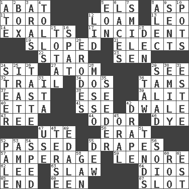 ACROSS 1. Blind as ____ 5. Raised railways 8. Cleo's killer 11. "Corrida" creature 12. Rich soil 13. Lion 14. Honors 17. Event 19. Inclined 21. Opts 22. Play the lead 23. Elected rep. 24. Be seated 27. Tiny particle 29. Perceive with the eye 32. Drop behind 34. Two (Sp.) 36. Scottish caps 37. Compass direction 38. Compass dir. 39. Came down and settled, as after flight 40. Singer James 41. Compass dir. 42. A sleeping potion; an opiate (poet.) 43. To sift 44. Aroma 46. Color 47. Shoshoni 50. Part of Q.E.F. 52. Went by 55. Window treatments 57. Electrical Measurement 59. Poe poem 62. Area sheltered from the wind 63. Cole _ (cabbage dish) 64. "Vaya con ____" 65. Conclusion 66. Car or cant ending 67. Position in a hierarchy or organization DOWN 1. Had dinner 2. Gift holder 3. Ancient river in northeast Turkey 4. For Whom the Bell _____ 5. Period of immesurable duration 6. Shoestrings 7. Grin 8. Actor Baldwin 9. Posted 10. Plant holders 12. Hat (slang) 15. "_____ Recall" 16. Petty quarrel 18. Lair 20. Eats (away) 24. Navigate 25. Feeling or showing extreme anger 26. Clothes sense 28. With motion or animation 29. Vegetable dish 30. Poet Dickinson 31. First name in cosmetics 33. Call ___ day 35. Sowing specialist 36. The 23rd letter of the Hebrew alphabet 42. Window treatment 45. Relating to the mouth 47. Purpose 48. Laconic 49. Peak District village in England 51. Looks after 52. Diluted with white 53. So be it 54. Moved rapidly 55. Morning condensation 56. Land 58. Separate the seeds from cotton 60. Friend of Pooh 61. Eastern Standard Time (abbr.)