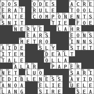 ACROSS 1. Two (Sp.) 4. Lyric poems 8. Land measure 12. Part of Q.E.F. 14. Governing power 15. Implement 16. Nathan's nickname 17. Parts 20. In a ____ (agitated or irritated) 21. Neckwear 22. Enemy 23. Impudent aggressiveness 27. Cowardly lion portrayer 29. Hearing organs 31. Immeasurably long periods of time 34. Paris' subway 35. Restaurants 36. Assistant 39. Cunning 41. Proofreading order 42. Detail 43. Started a card game 46. Lie 47. Spanish pot 48. Having or resembling wings 51. Some stationery 54. Fish or hair follower 56. Nilotic language 58. Indian skirt 61. The property of being fit to eat 66. Enthusiastic 67. Small Philippine buffalo 68. Writer Wiesel 69. Ubangi River tributary 70. Austrian-born American filmmaker Fritz 71. Beget 72. Ocean DOWN 1. Cub Scout units 2. NW Algerian seaport 3. Smooth fabric 4. The grampus (Milton) 5. Superhero pair 6. Shade tree 7. Back-to-school mo. 8. Had dinner 9. Meet 10. Printing process, for short 11. Otherwise 13. Wig 18. Lubricate 19. Teachers' org. 24. Portuguese money of account (variant) 25. Large container 26. Blunders 28. Robbery 30. Twentieth part of a lira 32. Compass dir. 33. Fast jet (abbr.) 34. Klaipeda city 36. Small island 37. Call ___ day 38. Conveyance 40. Sharp bark 44. According to 45. Infant locale 49. 100% 50. Sorrow 52. He sold his birthright 53. All-night dance parties 54. Anneal 55. Pulitzer Prize-winning author Ferber 57. Washington bills 59. Cause heat under the collar 60. The main thing one is thinking about 62. Container for groceries 63. Connecticut Ivy Leaguer 64. Title for a knight 65. Perceive with the eye