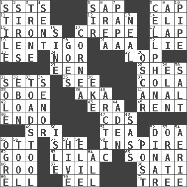 ACROSS 1. Fast planes 5. Plant excrement 8. Head covering 11. Hoop that covers a wheel 12. SW Asia republic 14. Biblical high priest 15. Removes the wrinkles 17. Streamer paper 18. Pet locale 19. Small, flat, pigmented spot on the skin 21. American Automobile Association (abbr.) 22. Falsehood 23. Compass dir. 24. Or not 25. Chop off 27. Car or cant ending 28. "______ My Girl" (Turtles hit) 31. Arranges properly for use 35. Perceive with the eye 37. Root beer relative 38. Mitch Miller's instrument 39. Alias (abbr.) 41. Of or related to the anus 42. Grant temporary use of 43. Epoch 45. Monthly bill 46. Inside; within (prefix) 47. Music discs 49. Indian title of respect (Mr.) 51. Beverage made from leaves 52. ___ good deed 55. Baseball player Mel 57. A female animal or person 60. Motivate 62. Thick or sticky substance 63. Pale purple color 65. Underwater navigation system 66. Friend of Pooh 67. Morally bad or wrong 68. Suttee (variant) 69. Pipe bend 70. Snakelike fish 71. Relationship diagram DOWN 1. Vertical member of a panel or frame 2. Begets 3. Marketplace scale 4. Emitted 5. Title for a knight 6. Type of rug 7. Dad 8. Portable communications device 9. Jai ____ 10. Corncob 13. Be tempered by heat 16. Trig term 17. Pupil covering 20. Leaves 26. Witty Wilde 29. Enthusiasm 30. Table seasoning 31. Not divided or shared with others 32. Inky black, to poets 33. Inedible or poisonous agaric 34. Sir (Sp.) 36. Make supply last 40. Northern region 44. An important port of Yemen 48. Backtalk 50. Small island 52. Middle Eastern gold or silver currency 53. Speak pompously 54. Nest on high 55. Legendary monster 56. Implement 58. Hub of activity 59. Writer Wiesel 61. Mail 64. 100%