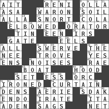 ACROSS 1. Small island 4. Painter Guido (1575-1642) 8. Water jar 12. White ___ sheet 13. Make _____ (do battle with) 14. Land 15. Silent film actress Nazimova 17. Derisive sound 18. Root beer relative 19. Shoved, as through a crowd 21. Speaker 23. Shallow baking pan 24. Car or cant ending 26. Big collection agency 27. Yard entry 28. Snakelike fish 30. Everything 31. Turn aside suddenly 34. Definite Article 37. Born 38. Collection of objects 39. Consenting reply 40. Followers of ems 41. Annoying sounds 42. Actress Charlotte 43. Water vessel 44. Parka part 46. Put into a specified state 47. Double-curved letter 50. The grampus (Milton) 51. Pressed 54. Window treatment 57. Cub Scout units 58. Nest on high 60. Neighbor of Neb. 62. Inside; within (prefix) 63. Feeling or showing extreme anger 64. Call ___ day 65. Arabian gulf 66. Settles 67. Fish or hair follower DOWN 1. Auto club (abbr.) 2. Capri or Wright 3. Baron Munchausen's specialties 4. The wife of a rajah (variant) 5. Eat (away) 6. Not either 7. To the inside or interior of 8. Motion picture awards 9. Plunders 10. _ and Stitch 11. Having or resembling wings 13. Compass dir. 16. "This won't hurt ____!" 20. Single 22. Cause heat under the collar 25. Effrontery 27. Small, secluded valley 29. Nights before holidays 30. A saturated hydrocarbon 31. Portico 32. Compose 33. Greek goddess of the dawn 34. Polypeptide antibiotic 35. Froth on beer 36. Compass dir. 41. Musical sound 43. Gillaume's butler role 44. Being at a high temperature 45. Mouths or openings 46. Message 48. Lean end of the neck 49. Sets or collections 51. The main thing one is thinking about 52. Tear apart 53. Raised platform 55. To separate or throw off 56. Nathan's nickname 59. Period 61. Krazy ___ of comics