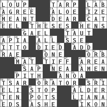 ACROSS 1. Central Nebraska county 5. Canvas cover 9. Experiment locale 12. Match 14. _ vera 15. Ending with capital 16. Intended 17. Letter starter 18. Feline 19. Snakelike fish 20. College papers 23. Coop moms 24. Highlander 25. Pulled tight 27. Capital of Western Samoa 30. 100% 32. Compass dir. 33. "Tell ____ the Marines!" 34. Passed on 36. Increase 38. Actress Charlotte 39. Single 40. Globe 43. Floor covering 46. Small quarrel 48. Type of rug 49. Plant excrement 51. Teachers' org. 52. So be it 53. Essential or central part 54. Small Philippine buffalo 56. Russian ruler of old 58. Speaker 61. Indian title of respect (Mr.) 64. Biblical high priest 65. Discontinue 66. Tree or shrub in the Birch family 68. "___ Little Indians" 69. Plant holders 70. Climbing, woody, usually tropical vines 71. Begley and Asner 72. American tennis player Robert 73. Visual representation of an object DOWN 1. Unable to walk 2. Double curve, resembling the letter S 3. Mountain range 4. Animal enclosure 5. Small amounts or degrees 6. Toward shelter 7. Exposes to great heat 8. For each 9. It is permitted: Lat. 10. Muslim summons to prayer 11. Antes 13. Singer James 21. Froth on beer 22. American author Paul (1891-1958) 23. Took on color 24. E Mali city 26. White ___ sheet 27. Atmosphere 28. Parent Teacher Association (abbr.) 29. Detail 31. Soviet premier 1918-24 35. Outscore 37. Dormintory (informal) 41. To sift 42. Prohibit 44. SW Saudi Arabia district 45. Make lace 47. Papal veil 48. American Automobile Association (abbr.) 50. Pictures 53. Aches 55. Spoken 56. False hair 57. Downhill vehicle 59. Writer of Portnoy's Complaint (1969) 60. Domed church section 61. Neighbor of Neb. 62. Former U.S. Attorney General Janet 63. SW Asia republic 65. Health resort 67. Cards in a Roman deck?