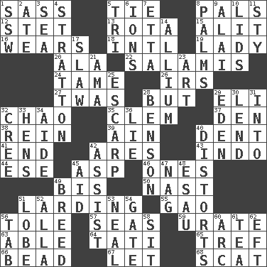 ACROSS 1. Backtalk 5. Make a knot 8. Friends 12. Proofreading order 13. Round or rotation of duties 15. Set down 16. Puts on (as clothing) 18. International (abbr.) 19. Kenny Rogers chart-topper in '80 20. In the manner of 22. Deli grouping 24. Not wild 26. Big collection agency 27. It was, poetically 28. With the exception that 29. Connecticut Ivy Leaguer 32. US Secretary of Labor Elaine L. _ 35. To starve (Brit.) 37. Lair 38. It's straight from the horse's mouth 39. The 18th letter of the Arabic alphabet 40. Incision 41. Conclusion 42. Ancient Greek god of war 43. Southeast Asian peninsula 44. Compass dir. 45. Viper 46. Washington bills 49. Altar cloth linen 50. Political cartoonist Thomas 51. Preparing or cooking with lard 55. E Mali city 56. Lacquered or enameled metalware 57. Oceans 59. A salt of uric acid 63. Competent 64. Jacques of French films 65. Unclean, religiously 66. Necklace unit 67. Allow 68. Get outta here! DOWN 1. Compass dir. 2. Had dinner 3. Ocean 4. Ski resort town in Vermont 5. Three (prefix) 6. Charged atoms 7. Singer James 8. Insides of hands 9. Mountain range southwest of Kyrgyzstan 10. Hats (slang) 11. Filthy place 14. Plant genus of onion and garlic 17. Cole _ (cabbage dish) 21. Nanny (var.) 23. Nonscientific branch of learning 25. Fortification 28. Gillaume's butler role 29. Genesis locale 30. Grant temporary use of 31. To the inside or interior of 32. Algonquian 33. Coop moms 34. Helper 36. Whopper 40. What propaganda does 42. Help 45. Help 47. Tired old horse 48. Son of Isaac 49. A special lineage 51. Ear part 52. Silent film actress Nazimova 53. Actress Patricia 54. Yard entry 56. Bar bill 58. Be seated 60. Curve 61. Beverage made from leaves 62. Lizard (obsolete)