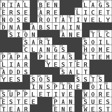 ACROSS 1. Monetary unit of Yemen 5. Benjamin's nick name 8. Straggles 12. Celtic language 13. "We ___ not amused" (Victoria) 14. It is permitted: Lat. 15. Sense of smell 16. Rotating or pertaining to rotation 19. Heredity factor (abbr.) 20. Choose not to consume 21. The Jewish people; Israel 23. One (Scot) 24. Affectionate concern, for short 27. Indian skirt 30. Land 31. Gives out a loud, resonant sound 34. Dwelling 35. Dad 38. Entreaties 40. A whole individual unit 41. One who doesn't tell the truth 42. Last past 44. Does sums 45. Table seasoning 46. Consenting reply 47. Distress signal 50. Fast planes 53. Motivate 57. Petroleum 59. Supplementary 63. Had on 64. First name in cosmetics 65. Baking dish 66. Takes to court 67. Pull apart 68. Compass dir. 69. Compass direction DOWN 1. Tear apart 2. Metal shackles 3. Slender Brazilian palm 4. Area sheltered from the wind 5. Sharp remark 6. Greek god of love 7. Remaining after all deductions 8. 54 in ancient Rome 9. Adept person 10. Set 11. Filthy place 14. Actor's bit 17. Auto club (abbr.) 18. Shallow baking pan 20. Of or related to the anus 22. Motion picture awards 24. A blast of a horn 25. Welles in "The Third Man" 26. Clement's nick name 28. Strike 29. In an inward manner 30. Upper-body garments 32. Unit of force equal to gravity 33. Backtalk 35. Shaw product 36. Assistant 37. Writing tablets 39. R.R. building 43. Otherwise 47. Drop; flow; fall 48. Single 49. Fast jet (abbr.) 51. Woman's close-fitting hat 52. Begets 54. Corncob 55. "Terrible" tsar 56. French philosopher Descartes 58. For fear that 59. Arrange properly for use 60. Purpose 61. Parent Teacher Assoc. 62. For each 63. Compass dir.