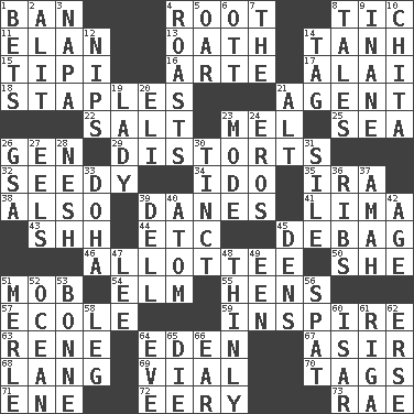 ACROSS 1. Prohibit 4. Carrot, for example 8. Nervous spasm 11. Style 13. Pledge 14. Hyperbolic tangent 15. Native american tent (variation) 16. Johnson of "Laugh-In" 17. Jai _ 18. Paper fasteners 21. Representative 22. Table seasoning 23. Cartoonist voice _ Blanc 25. Ocean 26. Commissioned mil. rank 29. What propaganda does 32. Sleazy 34. Wedding promise 35. Lyricist Gershwin 38. In addition 39. Natives or inhabitants of Denmark 41. Pale green bean 43. Quiet! 44. And so on (abbr.) 45. Debunk (Brit. slang) 46. One to whom something is allotted 50. A female animal or person 51. Disorderly crowd 54. Shade tree 55. Coop moms 57. Learning spot: Fr. 59. Stimulate to action 63. French philosopher Descartes 64. Locale of original sin 67. SW Saudi Arabia district 68. Long (Scottish) 69. Small bottle 70. Labels 71. Compass dir. 72. Suggestive of the supernatural 73. Actress Charlotte DOWN 1. Stakes 2. Came down and settled, as after flight 3. California wine valley 4. Cooks with dry heat, as in an oven 5. Rowing implement 6. Baseball player Mel 7. Definite Article 8. Falsehoods 9. Lacking in sense or substance 10. Riviera of "Kiss of the Spider Woman" 12. Pinches, bites 14. Label 19. Kenny Rogers chart-topper in '80 20. Connecticut Ivy Leaguer 21. Keyboard modifier key 23. Method 24. Greek god of love 26. Girls' org. (abbr.) 27. Snakelike fish 28. Tender 30. Tinged 31. Filth; sediment 33. Capital of the state of Qatar 36. Chest bones 37. Nursemaid 39. Small valley 40. Smallest unit of an element 42. Personal question 45. Habitations of wild animals 47. Area sheltered from the wind 48. Without force or sincere effort 49. Car or cant ending 51. Haggard of country music 52. Sea 53. Child's nurse 56. Petty quarrel 58. Part of a journey 60. Austrian river, tributary to the Danube 61. Port city in Latvia 62. Celtic language 64. Night before a holiday 65. Pass on 66. Hearing organ